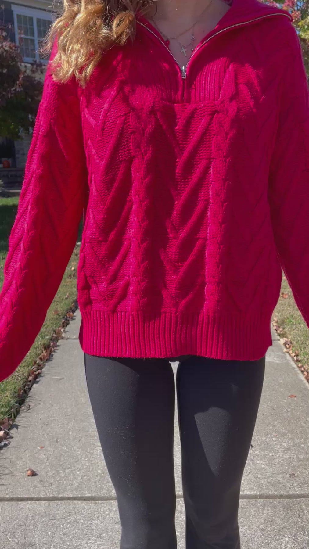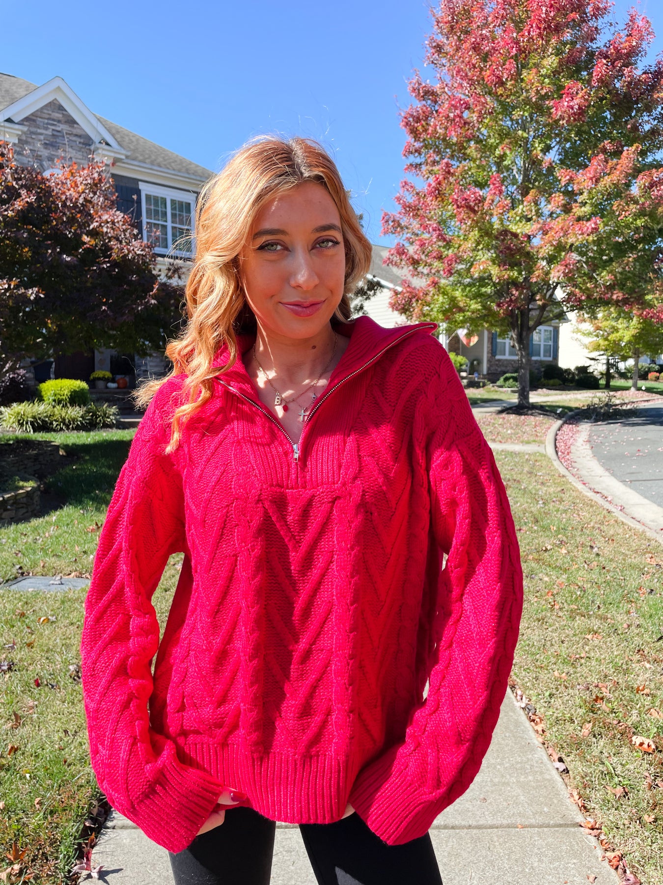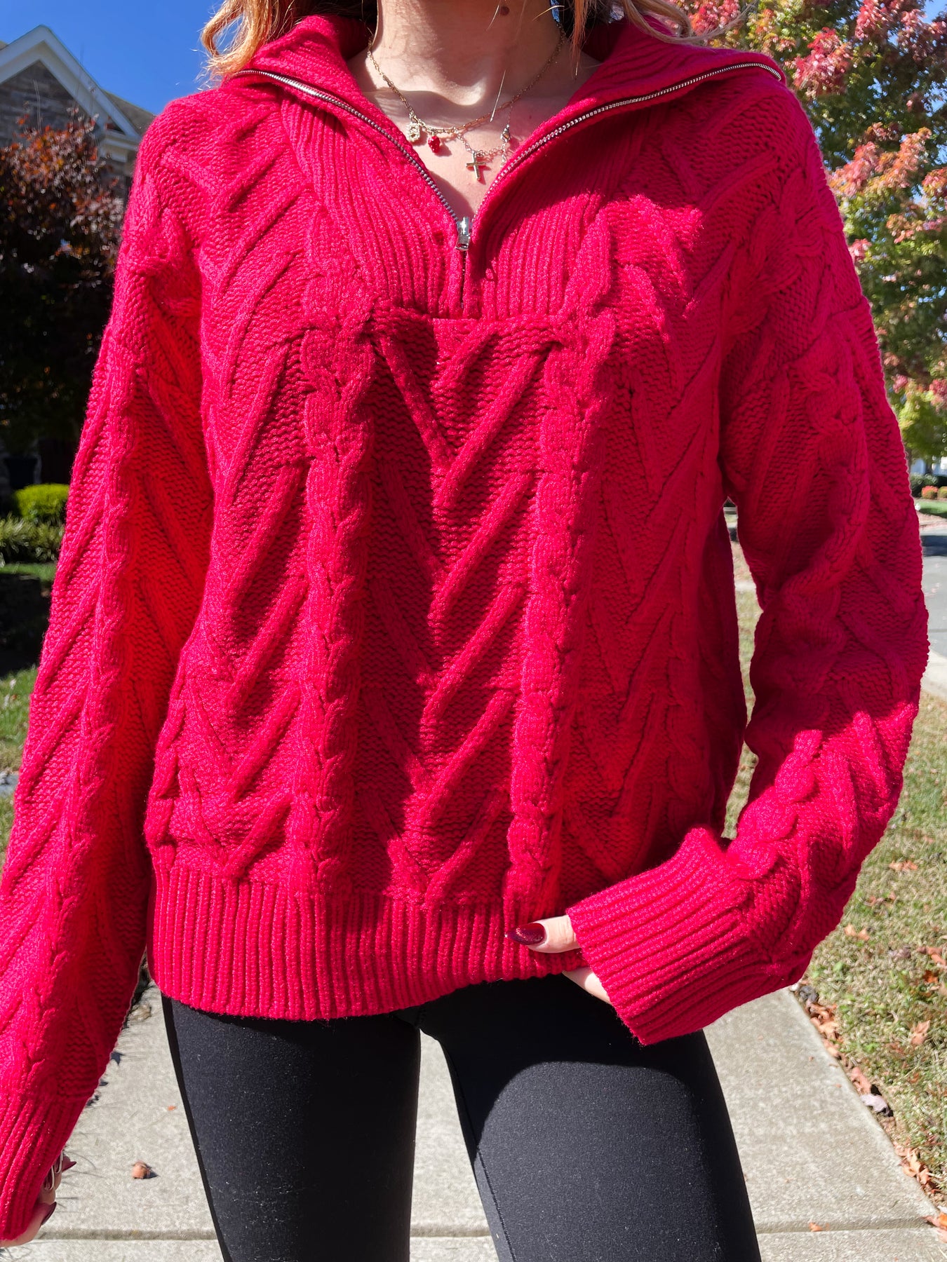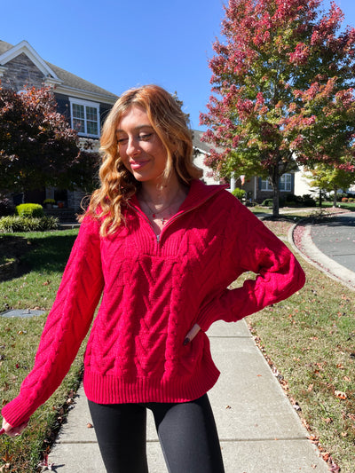 Stay cozy in style with this red cable knit zip-up sweater! Featuring a classic cable knit design, a full-length zipper, and a high collar, it’s perfect for layering on chilly days. Soft, warm, and effortlessly stylish, this sweater adds a pop of color to any outfit—your new go-to for fall and winter!