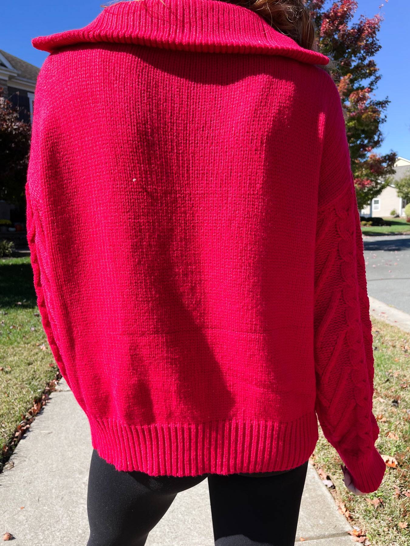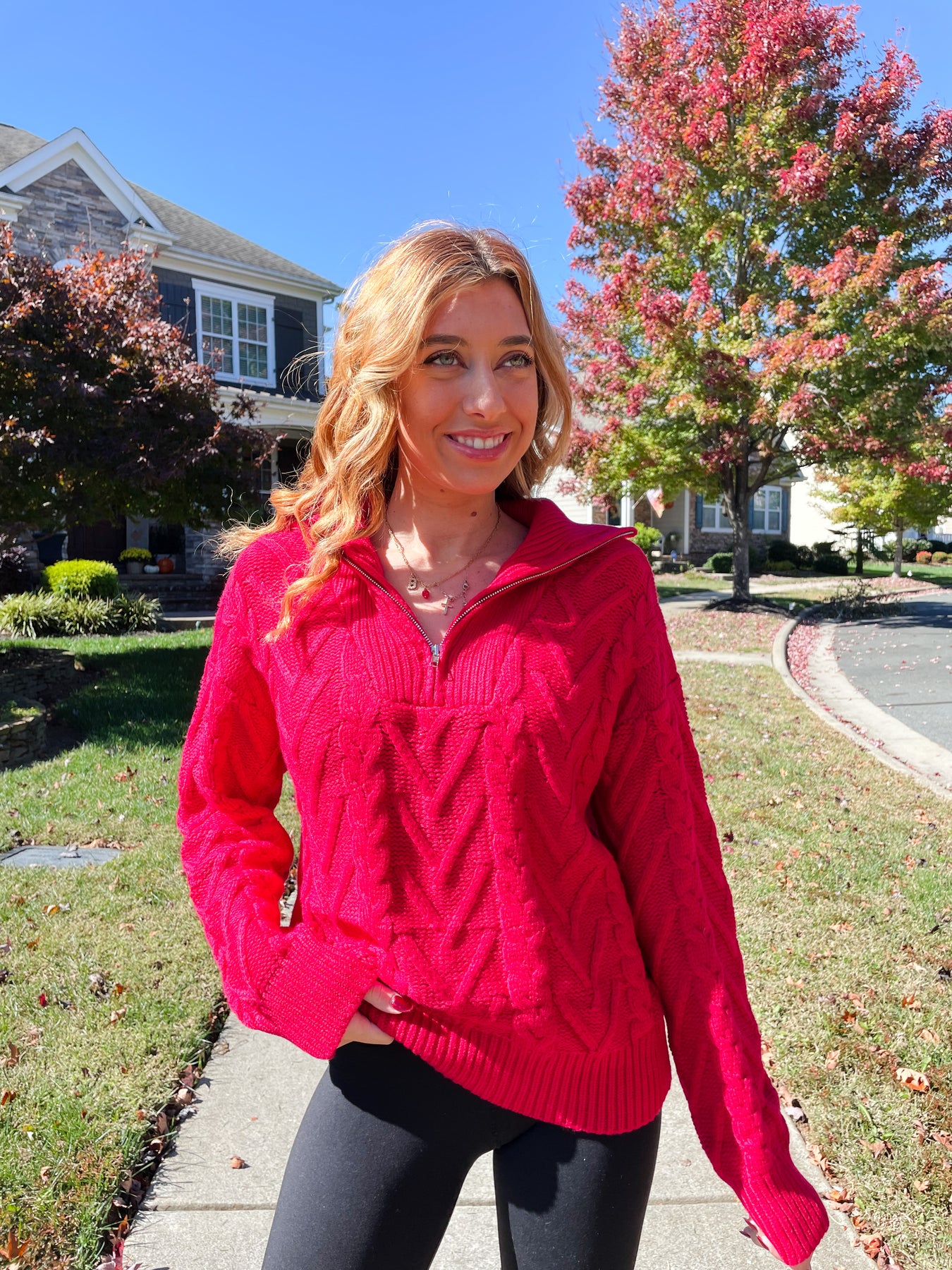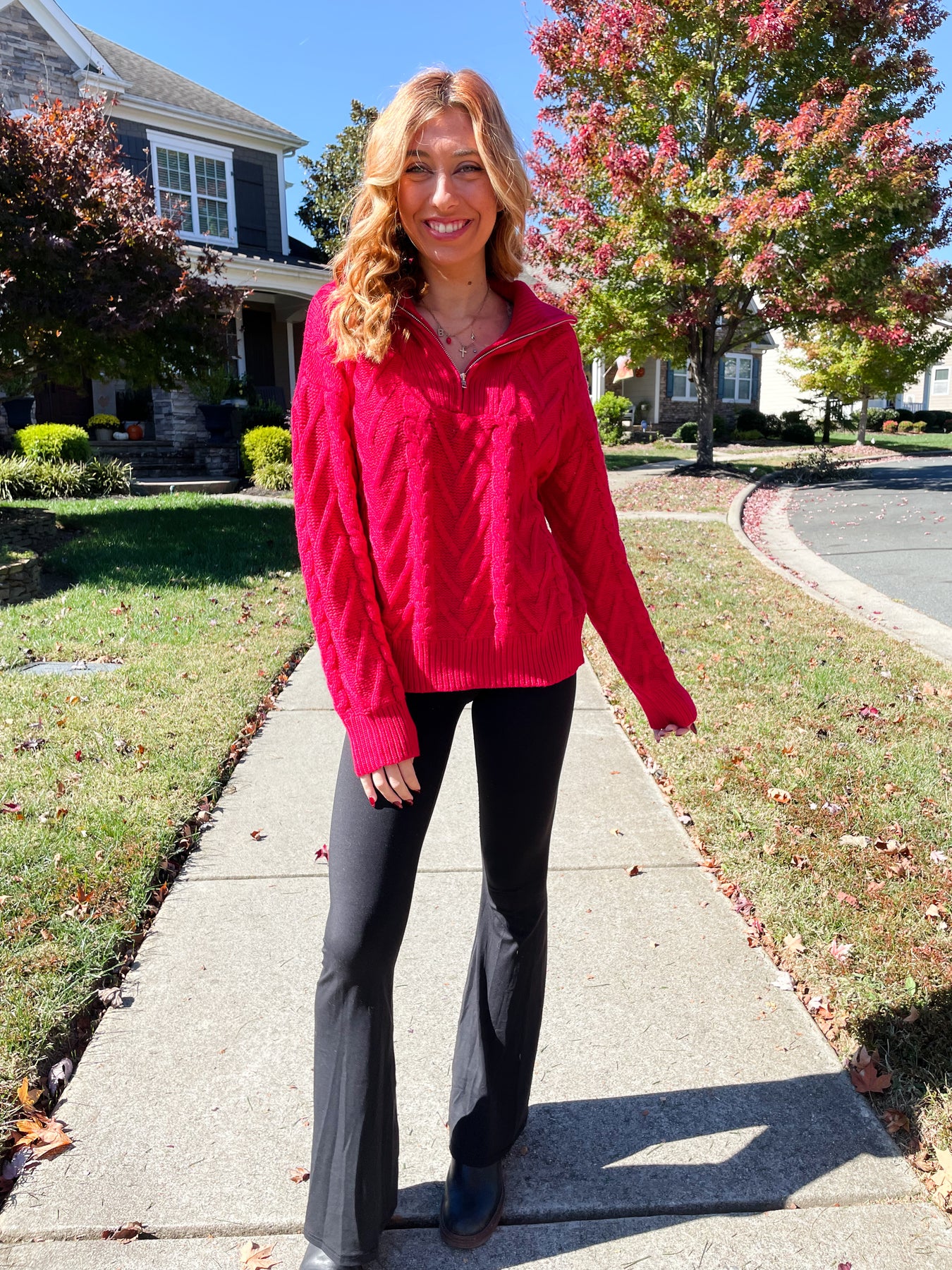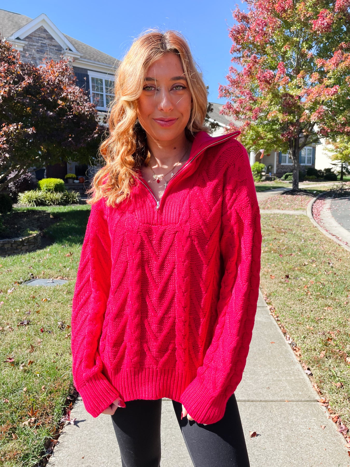 Stay cozy in style with this red cable knit zip-up sweater! Featuring a classic cable knit design, a full-length zipper, and a high collar, it’s perfect for layering on chilly days. Soft, warm, and effortlessly stylish, this sweater adds a pop of color to any outfit—your new go-to for fall and winter!