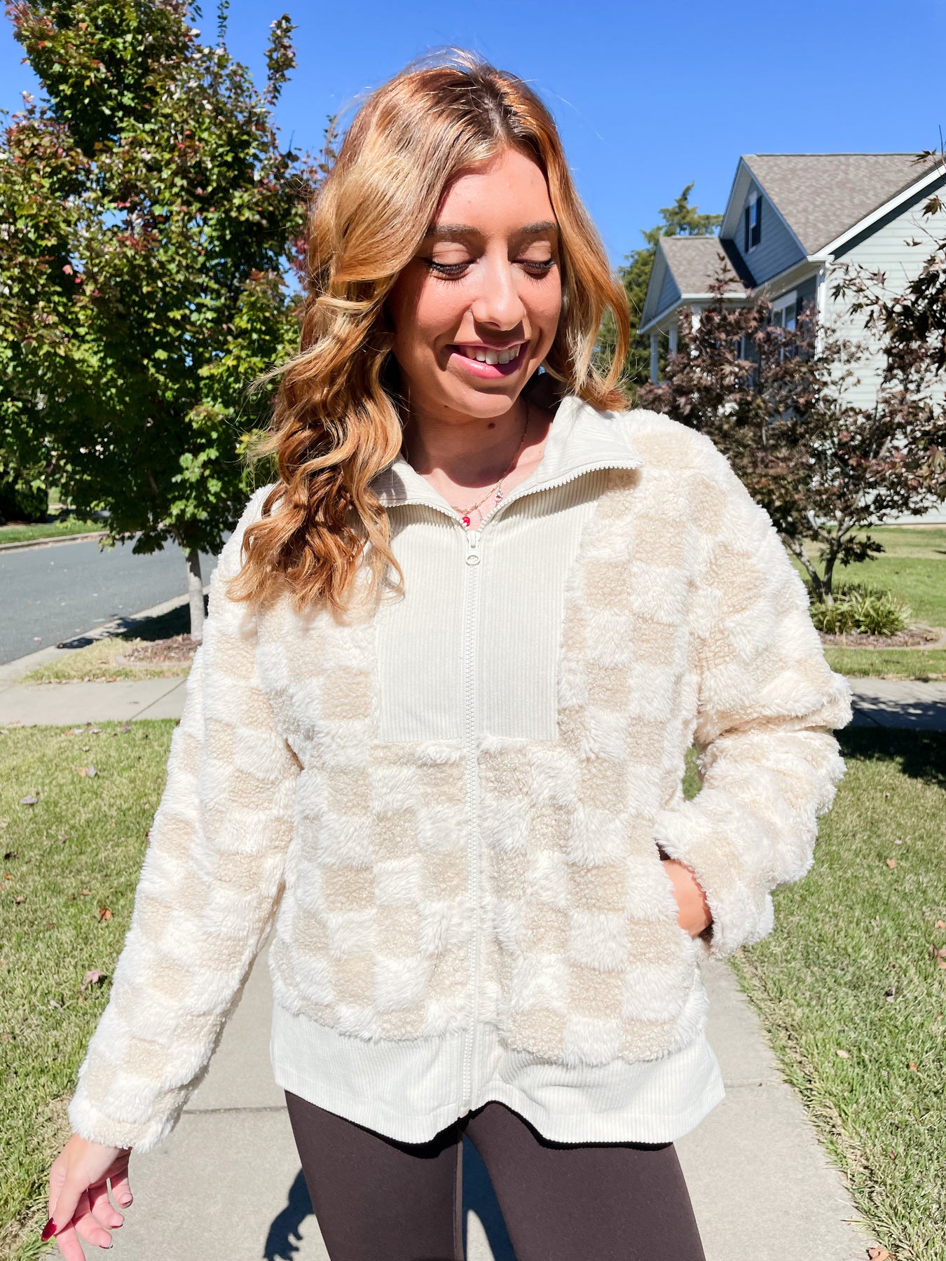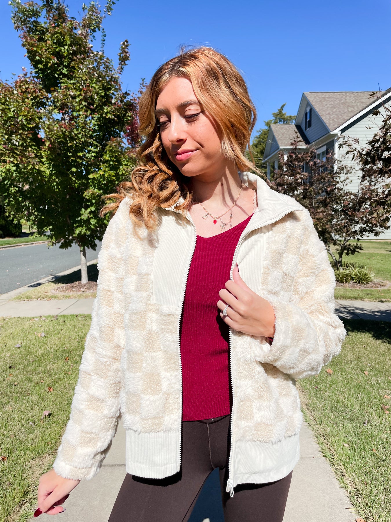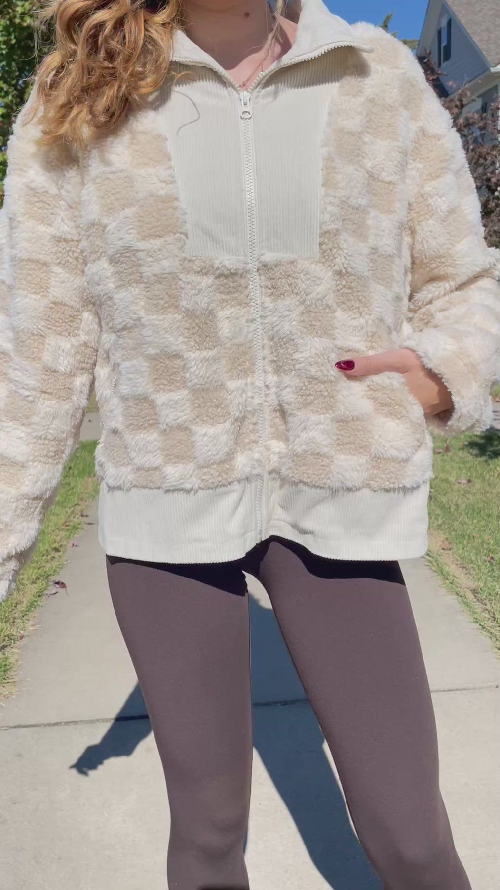 Stay warm and stylish with the Cozy Check-in Sherpa Jacket. Featuring a playful checker pattern and contrast corduroy accents, this zip-up jacket adds a fresh twist to your casual wardrobe. Functional pockets provide convenience while enhancing the look, making it the perfect choice for effortless comfort and everyday fashion.