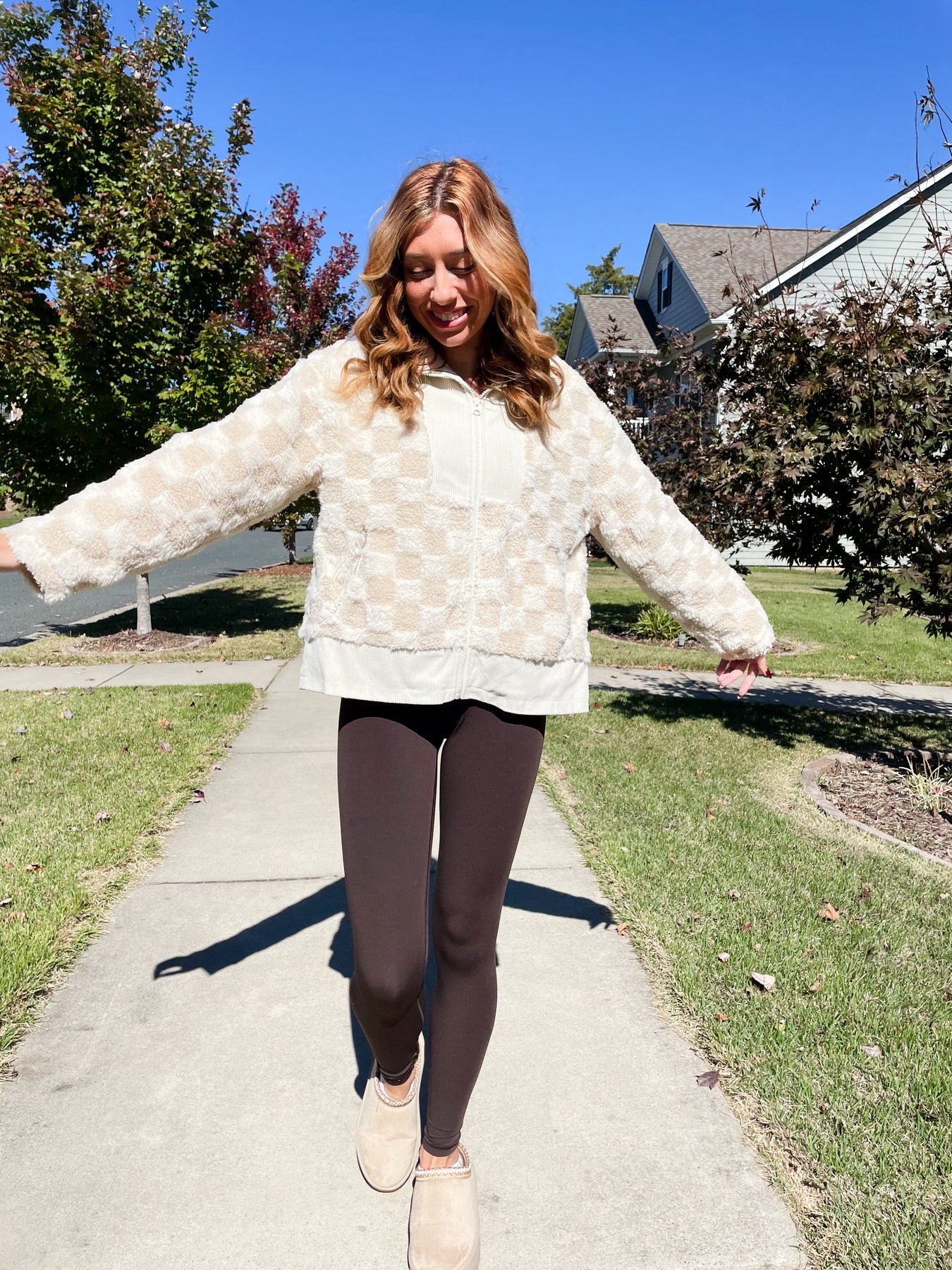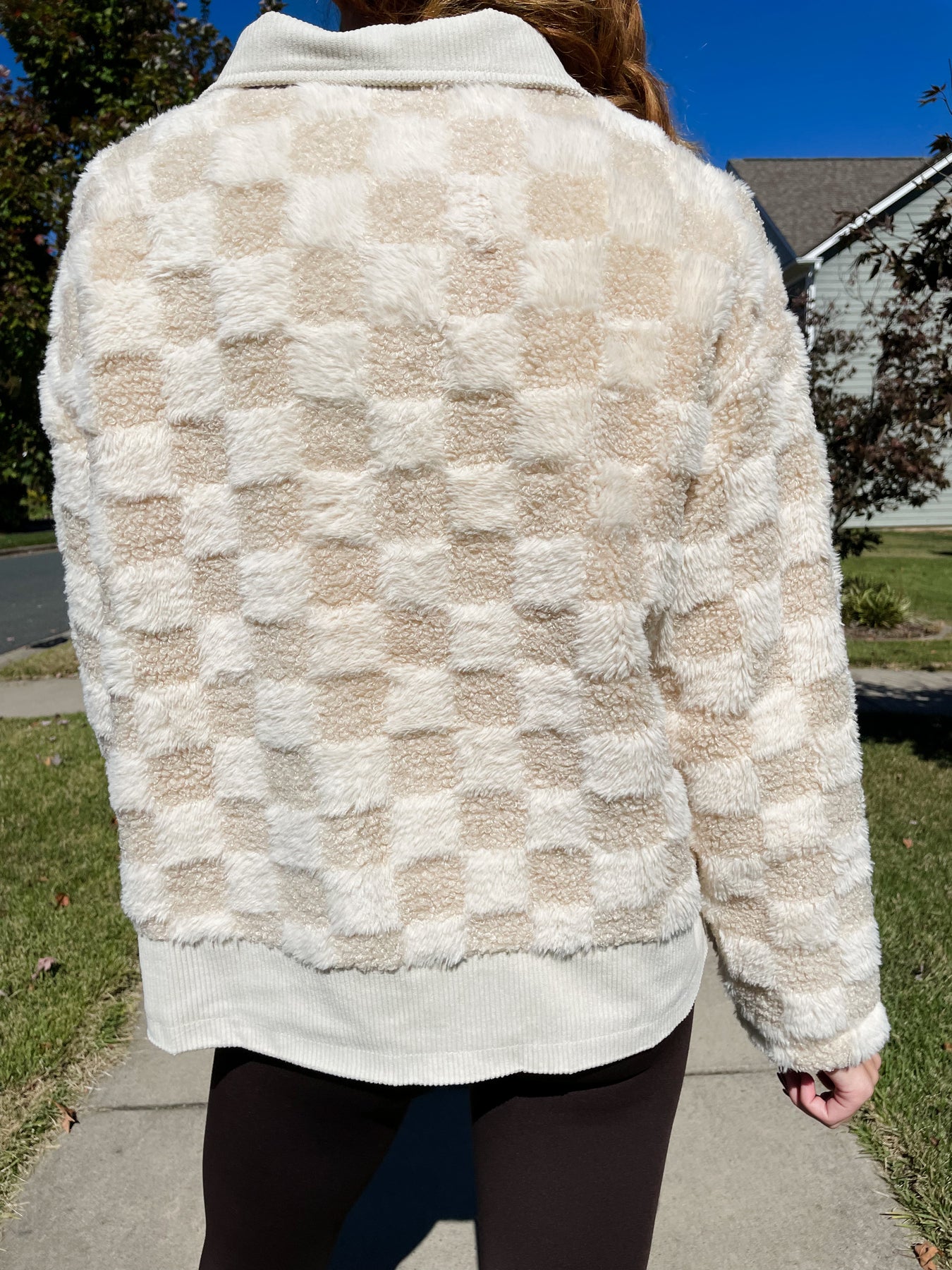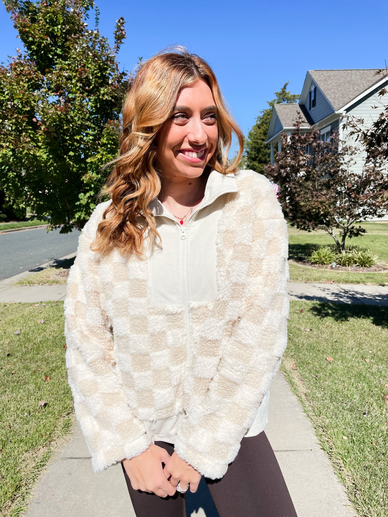 Stay warm and stylish with the Cozy Check-in Sherpa Jacket. Featuring a playful checker pattern and contrast corduroy accents, this zip-up jacket adds a fresh twist to your casual wardrobe. Functional pockets provide convenience while enhancing the look, making it the perfect choice for effortless comfort and everyday fashion.
