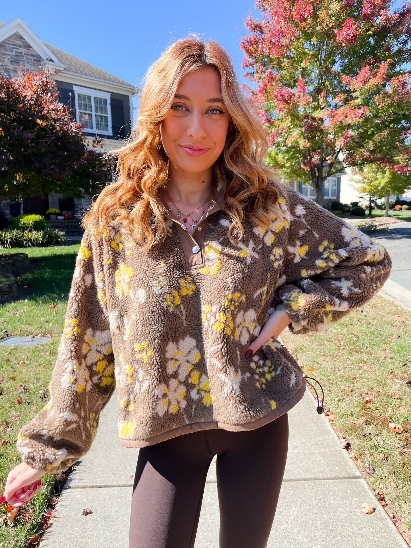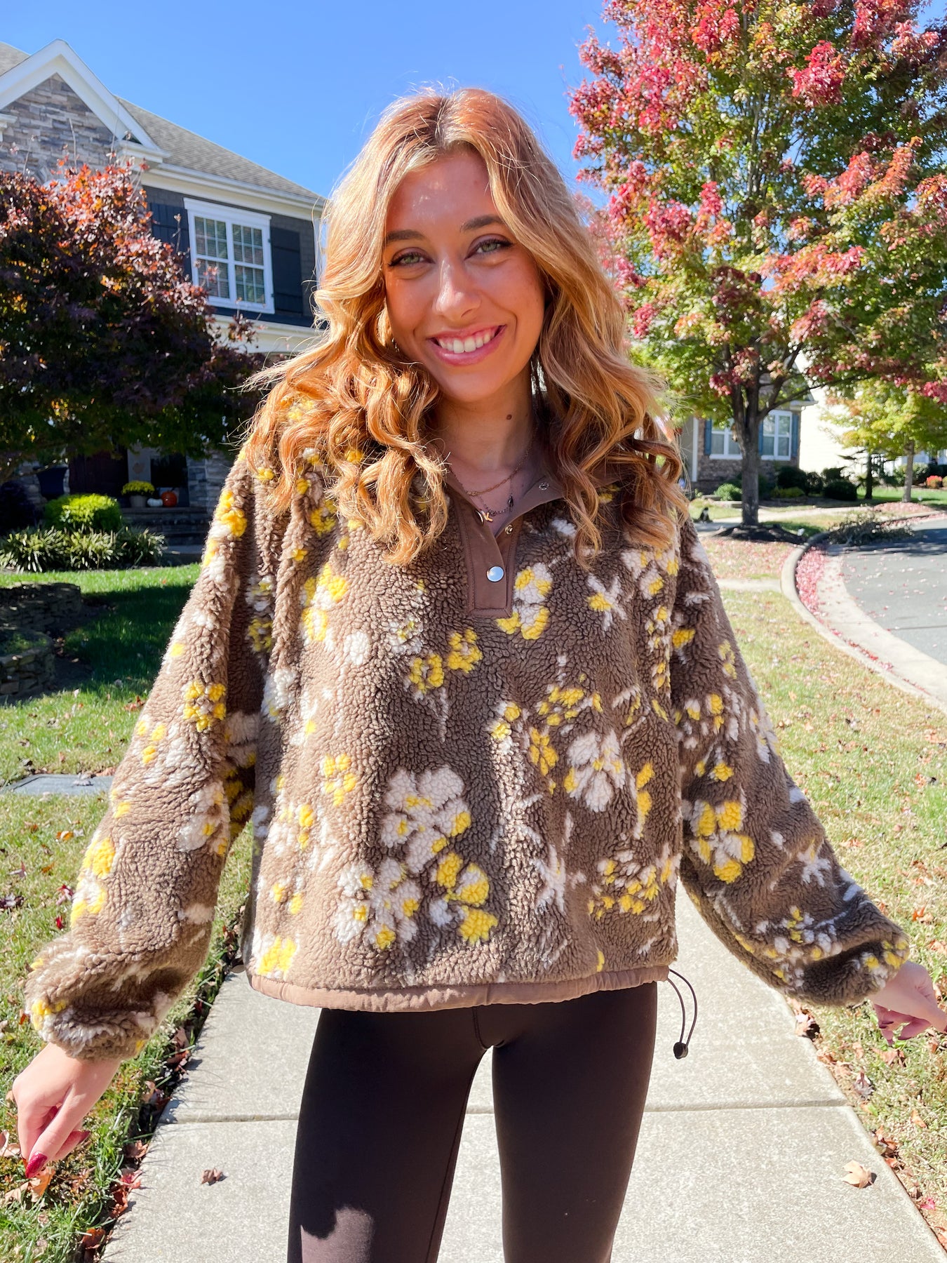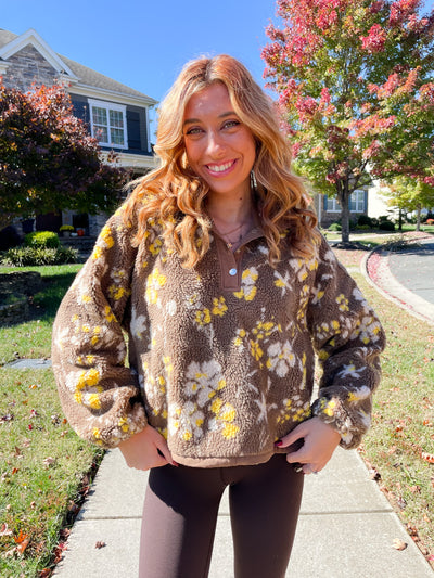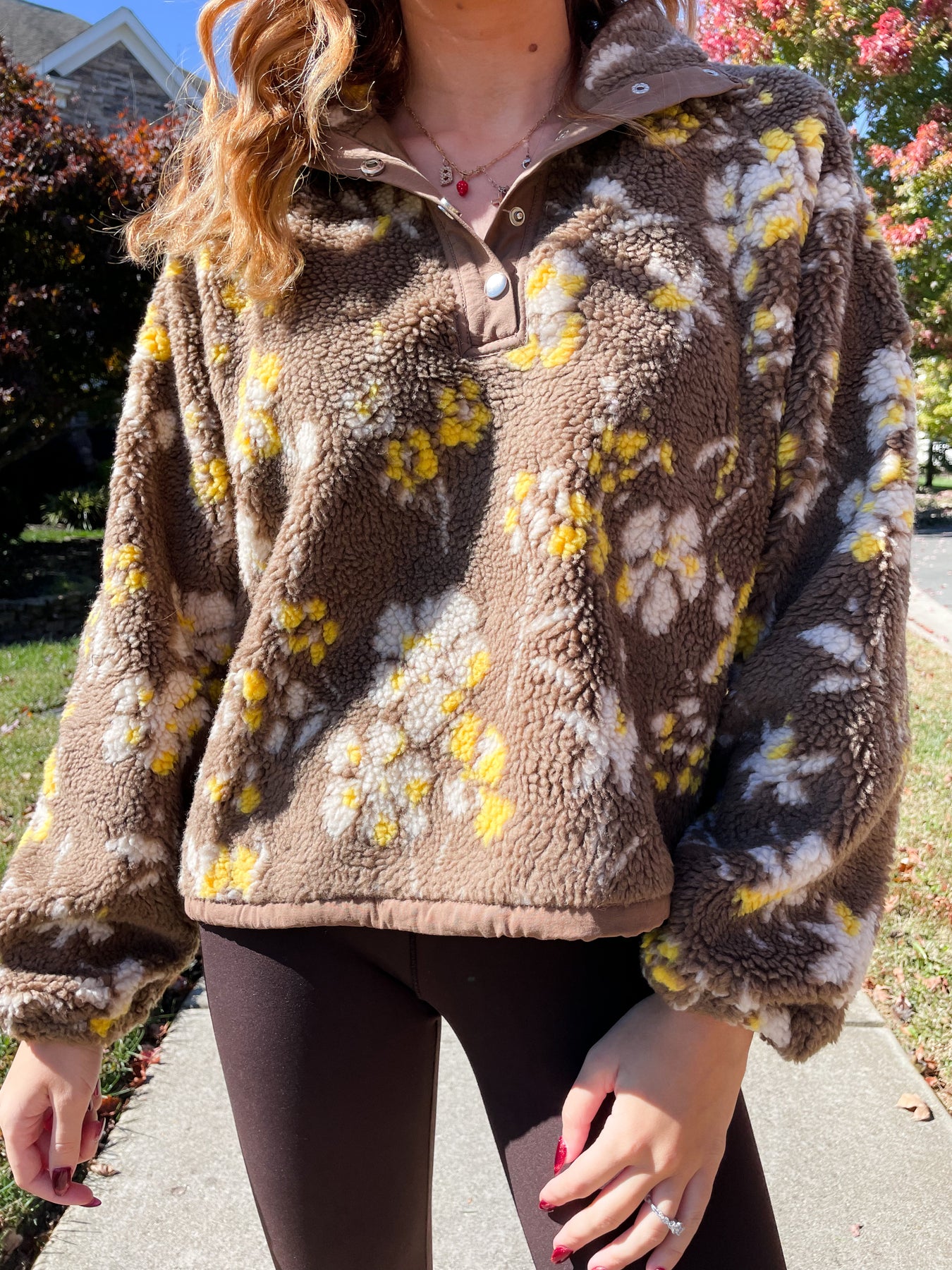 Experience cozy comfort with our Floral Sherpa Snap Button Pullover. Crafted from soft floral print sherpa fabric and lined with breathable cotton, it keeps you warm without sacrificing style. Contrast binding accents and metal snap buttons add a refined touch, while the toggle elastic drawstring at the bottom offers a customizable fit. Perfect for chilly days, this pullover blends functionality with fashionable details effortlessly.