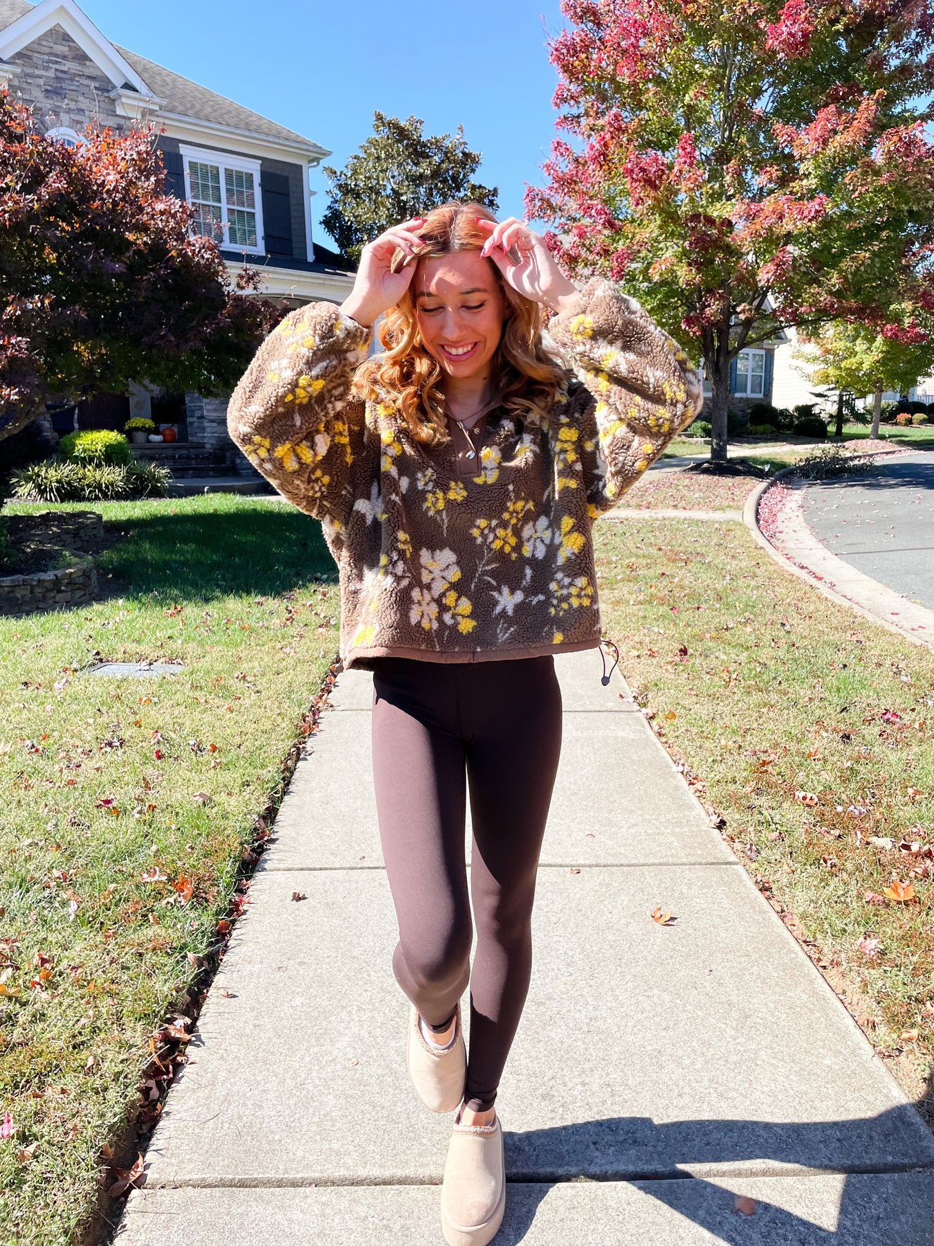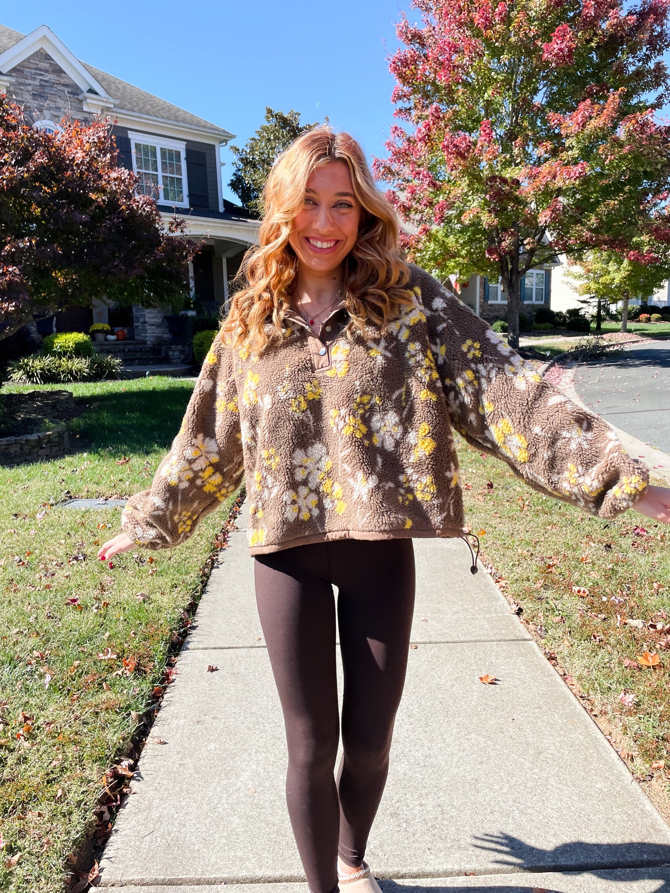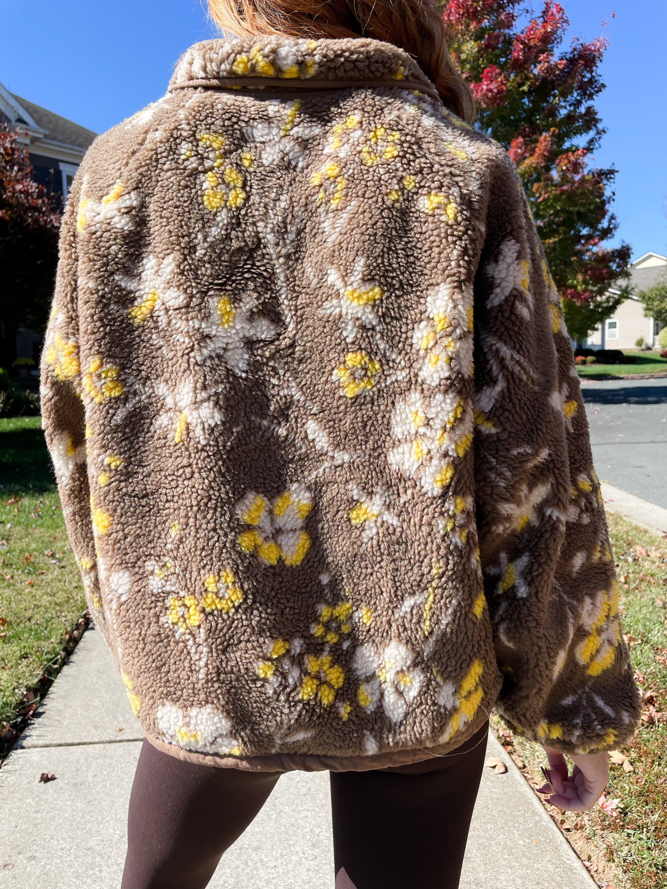 Experience cozy comfort with our Floral Sherpa Snap Button Pullover. Crafted from soft floral print sherpa fabric and lined with breathable cotton, it keeps you warm without sacrificing style. Contrast binding accents and metal snap buttons add a refined touch, while the toggle elastic drawstring at the bottom offers a customizable fit. Perfect for chilly days, this pullover blends functionality with fashionable details effortlessly.