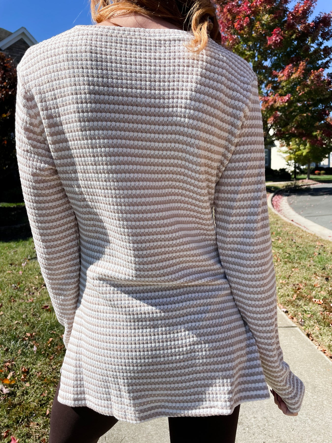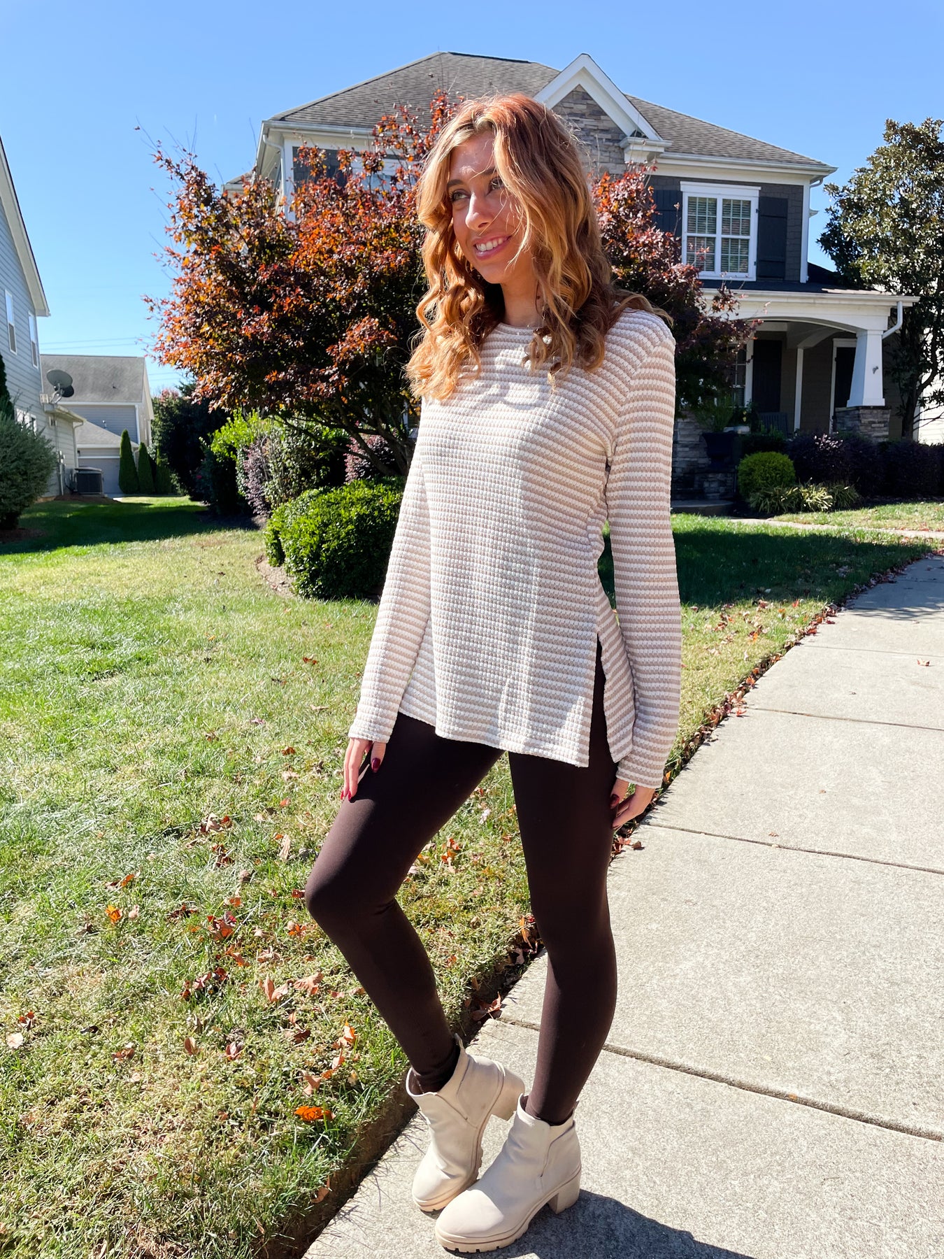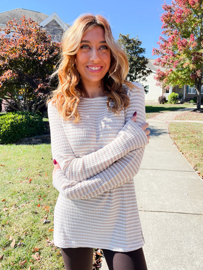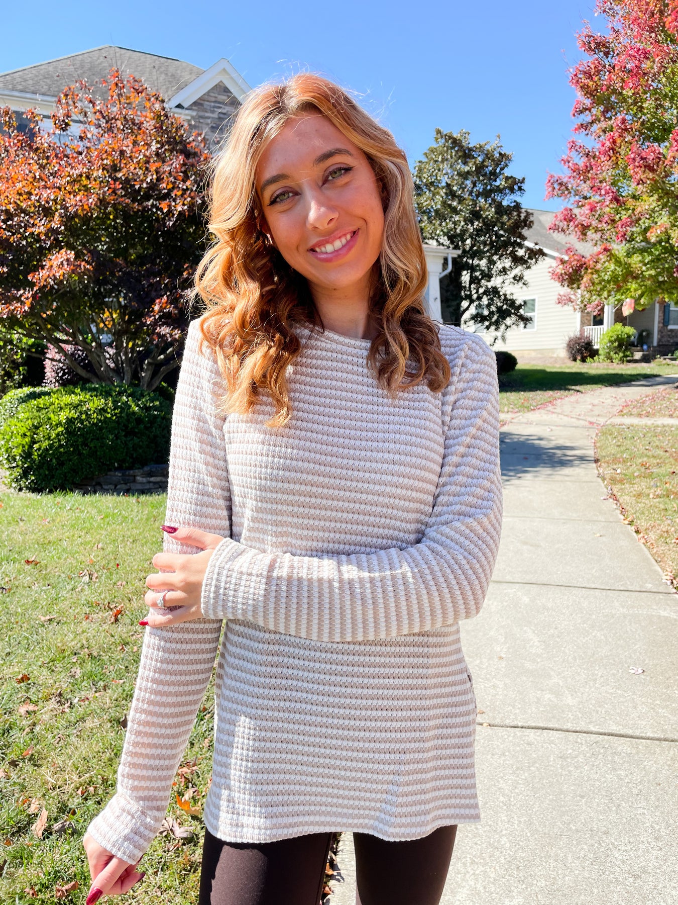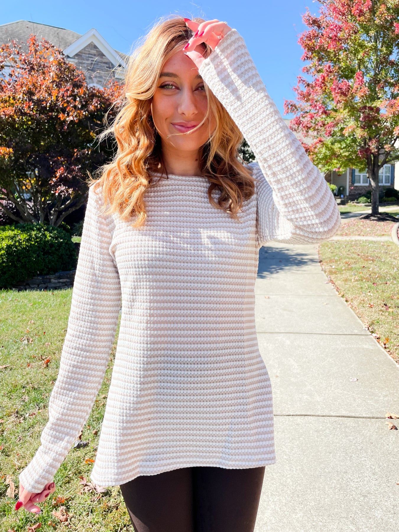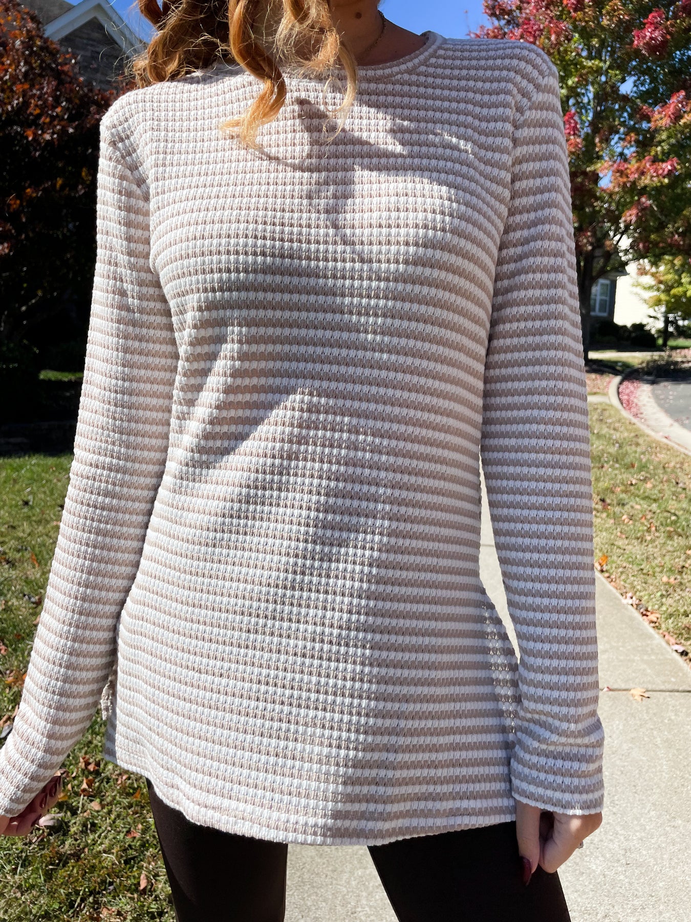 Refresh your wardrobe with the Cream Striped Top, featuring a classic knit that delivers timeless texture and a flattering visual appeal. Its slim fit gently enhances your silhouette while ensuring comfort throughout the day. Side slits provide added movement and make layering simple, while the round neck style beautifully showcases your favorite necklaces or statement earrings. This top is a versatile piece designed for both style and ease.