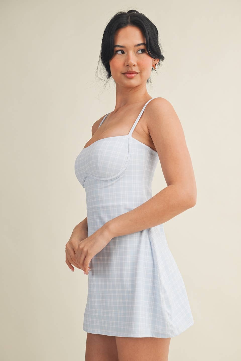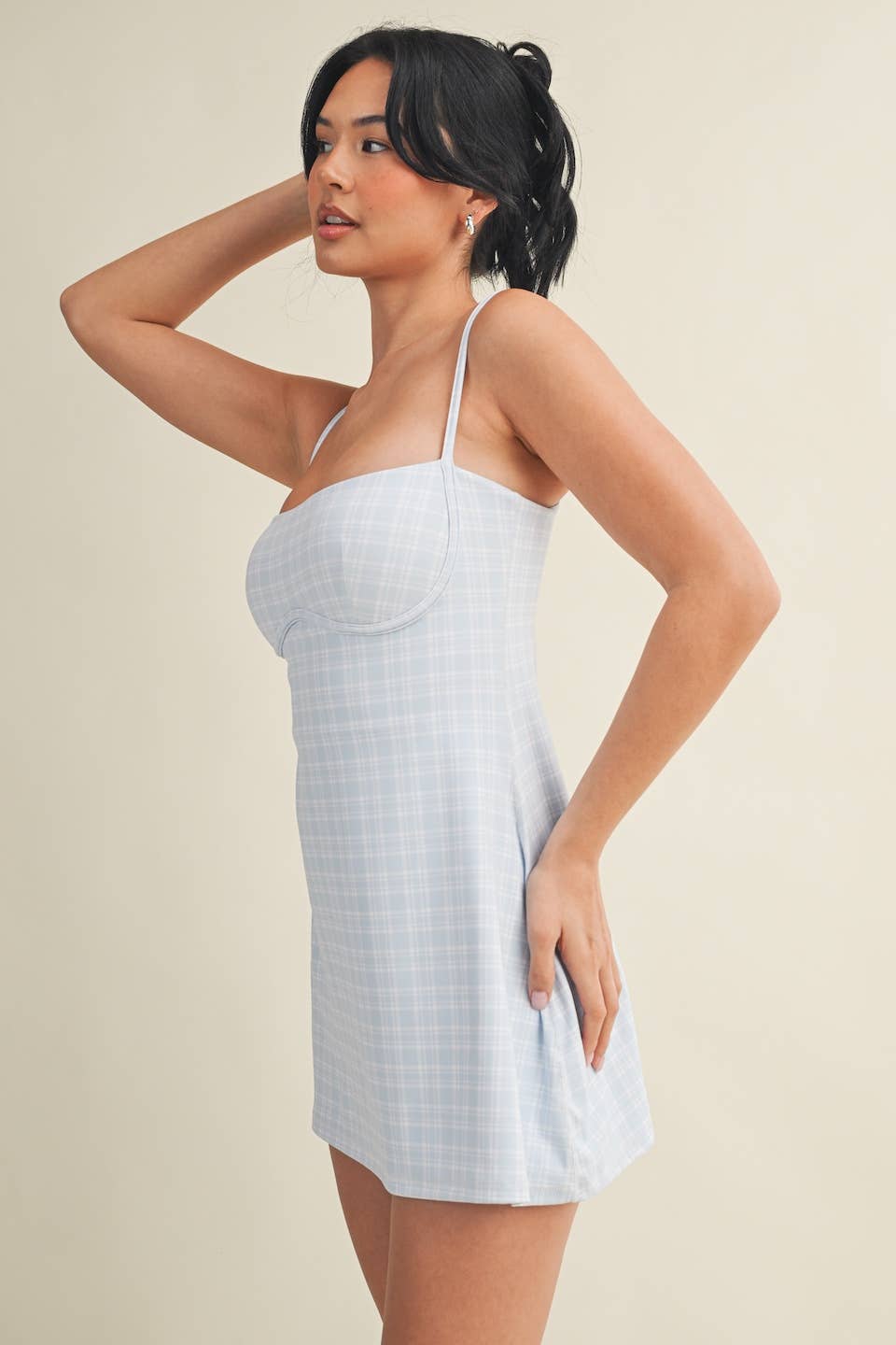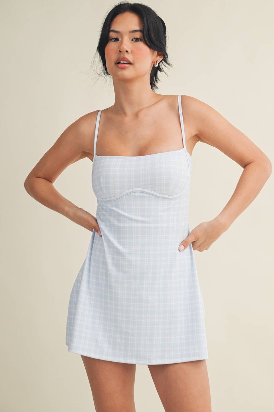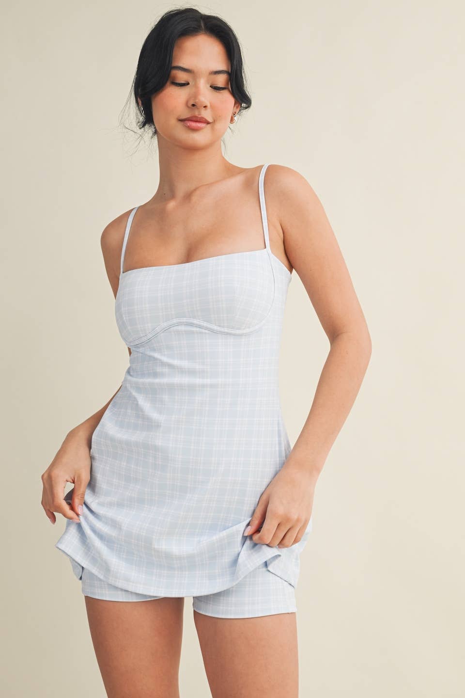 Plaid-print Sweetheart Dress with a shorter length and a narrower bust for a more flattering look. Less ease at the waist and internal shorts. Trendy and functional exercise dress comes with built-in bra, spaghetti straps, short liners, and four-way stretch fabric to give you support and comfort wherever your day takes you.