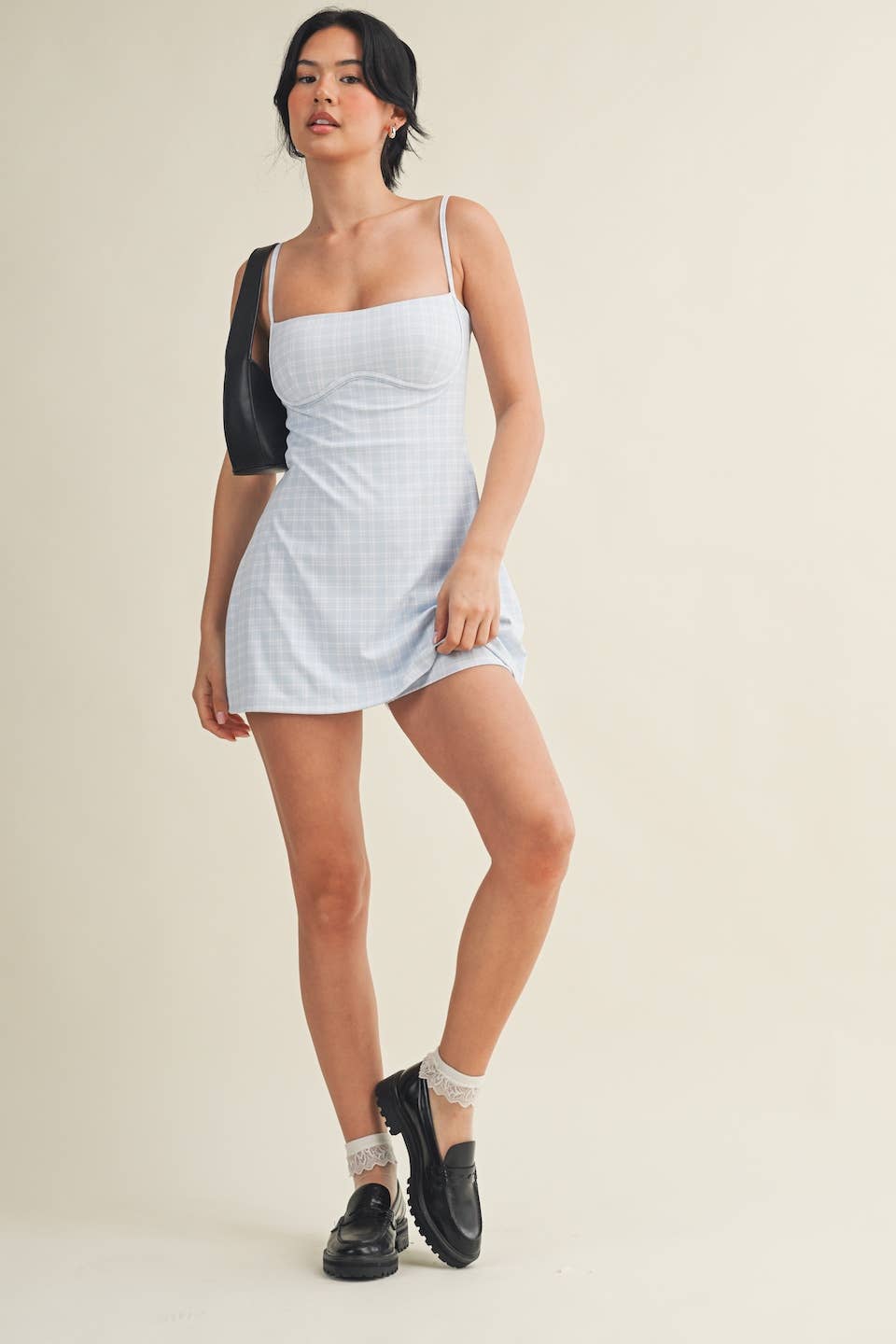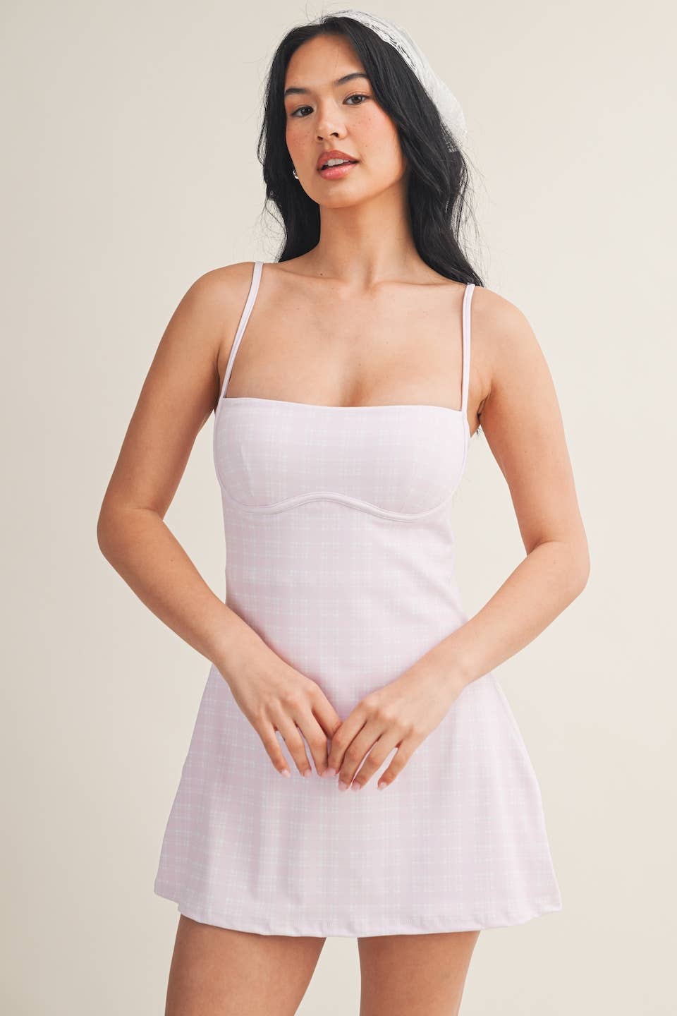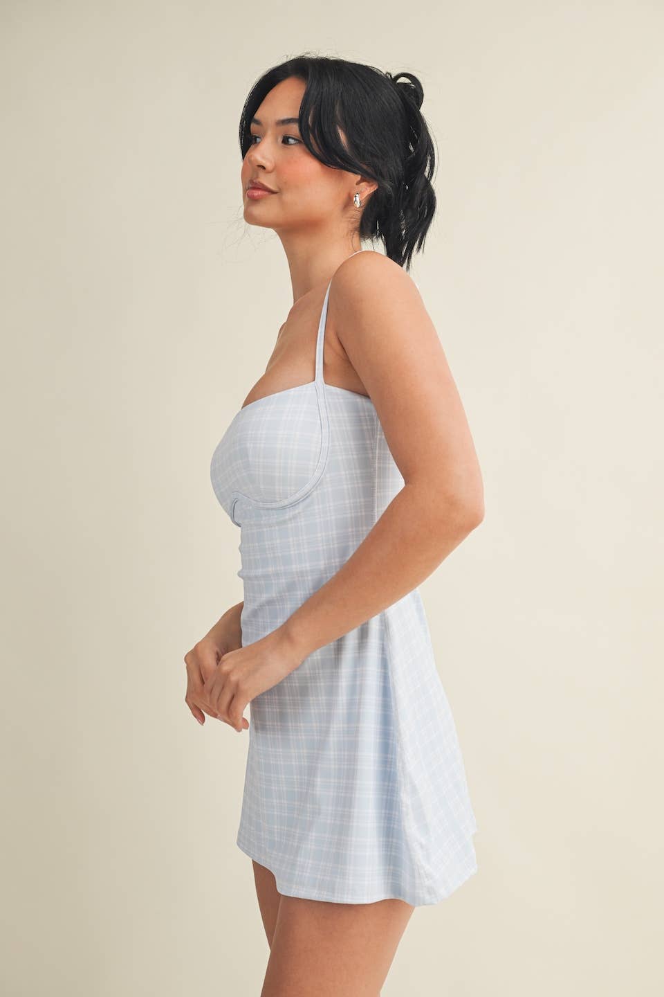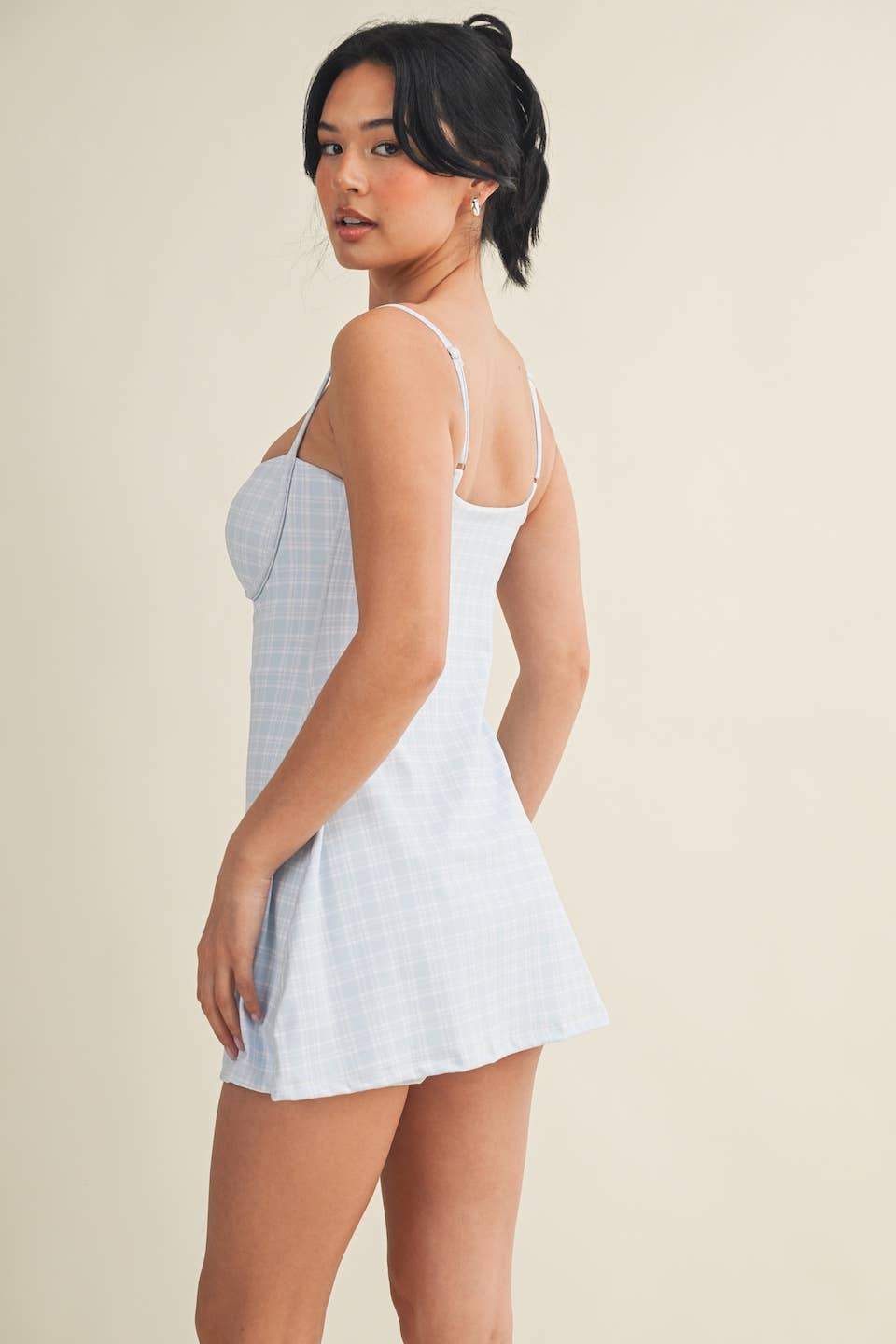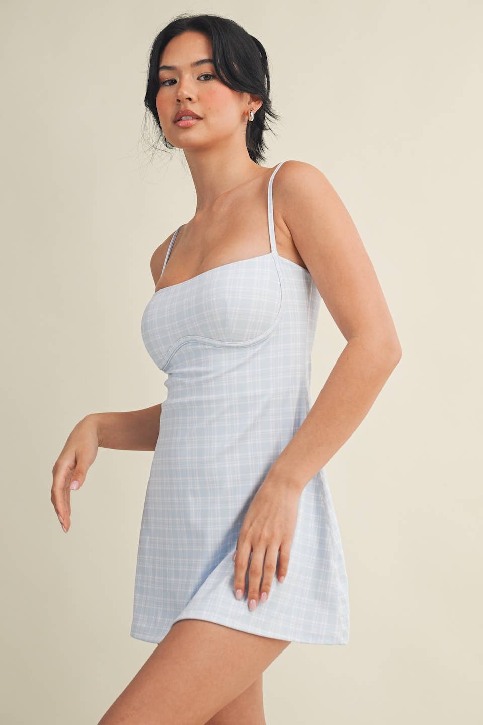 Plaid-print Sweetheart Dress with a shorter length and a narrower bust for a more flattering look. Less ease at the waist and internal shorts. Trendy and functional exercise dress comes with built-in bra, spaghetti straps, short liners, and four-way stretch fabric to give you support and comfort wherever your day takes you.