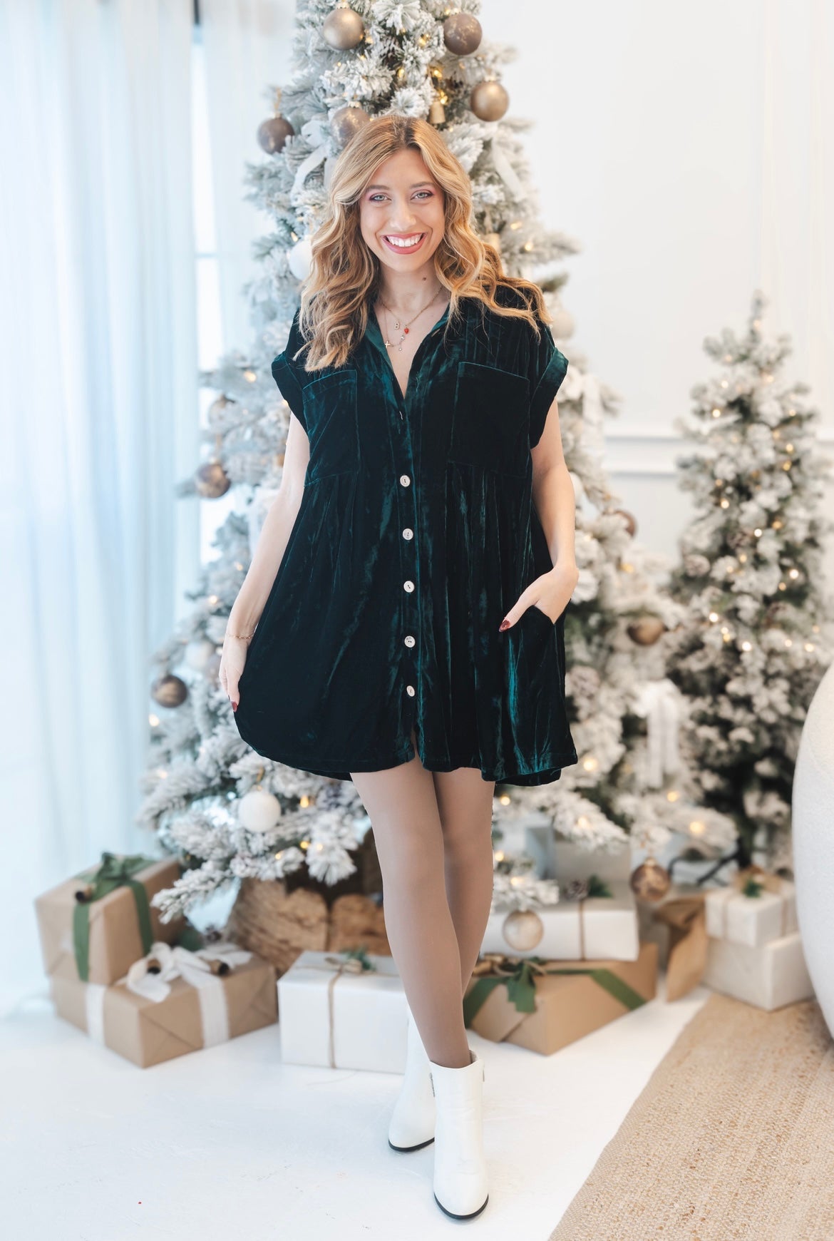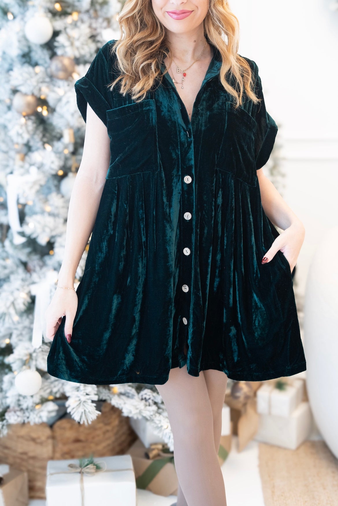 Indulge in timeless elegance with this luxurious velvet mini dress, designed to transition seamlessly from holiday celebrations to everyday sophistication. The button-down front and vintage-inspired cap sleeves create a refined silhouette, while functional chest pockets add practical charm. Soft pleating flows across the back, enhancing movement and creating an effortlessly flattering A-line shape. Crafted in sumptuous wine-red velvet, this versatile piece works beautifully for festive gatherings, game day outings, or whenever you want to feel polished and put-together. A wardrobe essential that delivers both style and comfort.