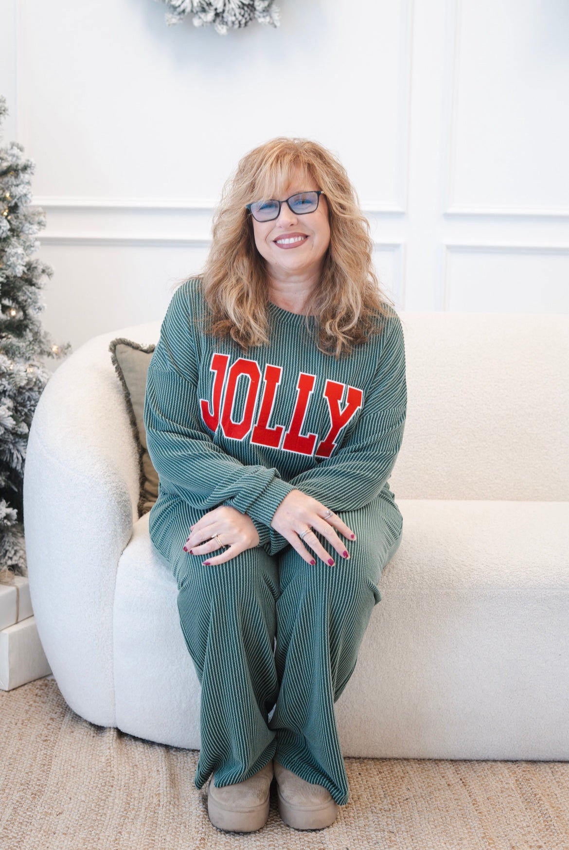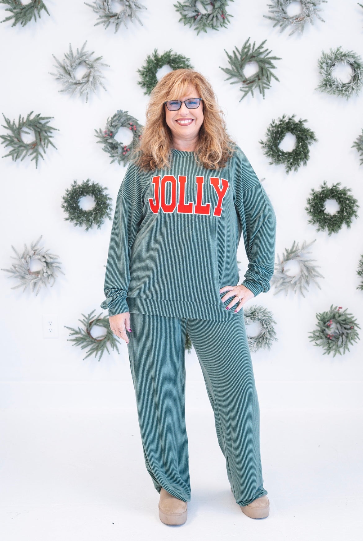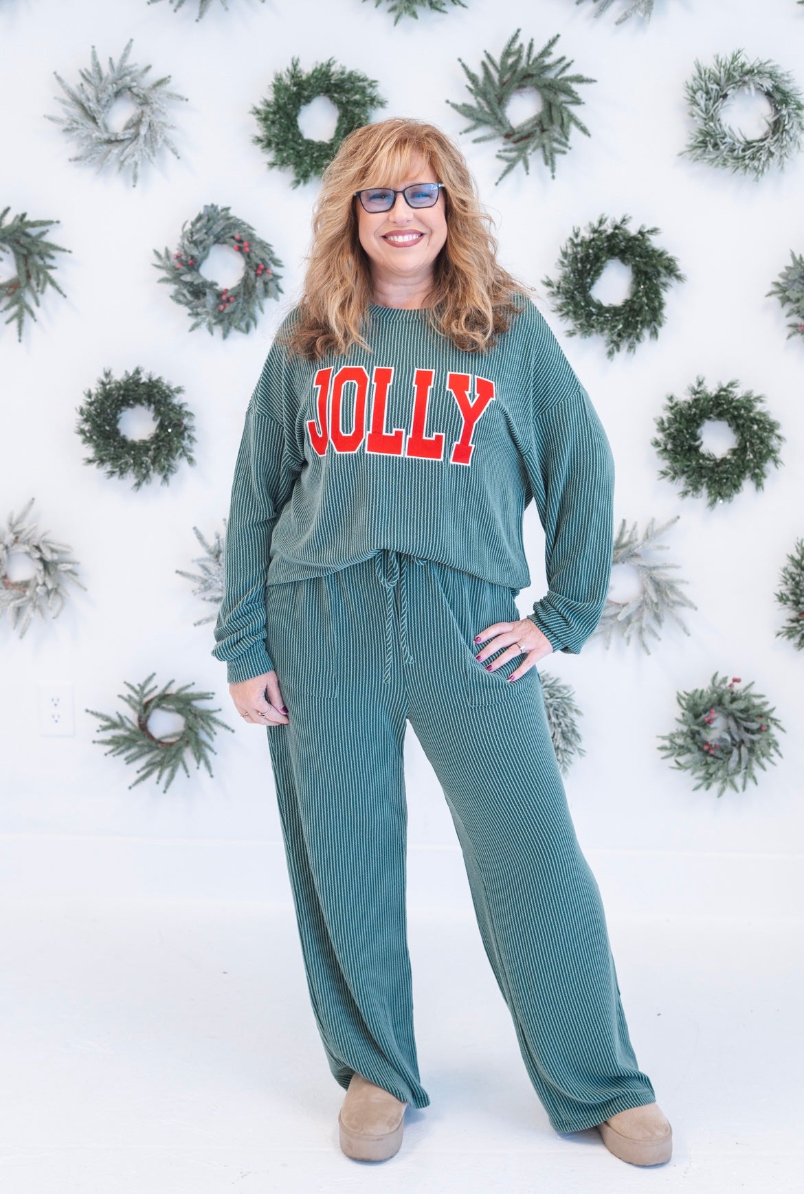 Embrace effortless elegance with the Jolly Pant Set—a luxurious two-piece ensemble designed for versatility. Featuring a coordinated long-sleeve top and matching pants in sumptuous ribbed knit, this set transitions seamlessly from weekend errands to relaxed evenings at home. The sophisticated "JOLLY" pattern elevates your casual wardrobe with understated charm, while premium fabric ensures all-day comfort and a refined silhouette. Perfect for those who refuse to compromise between style and ease.