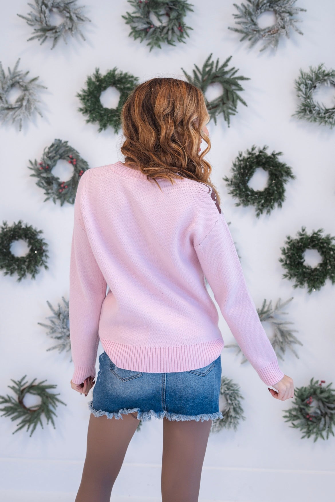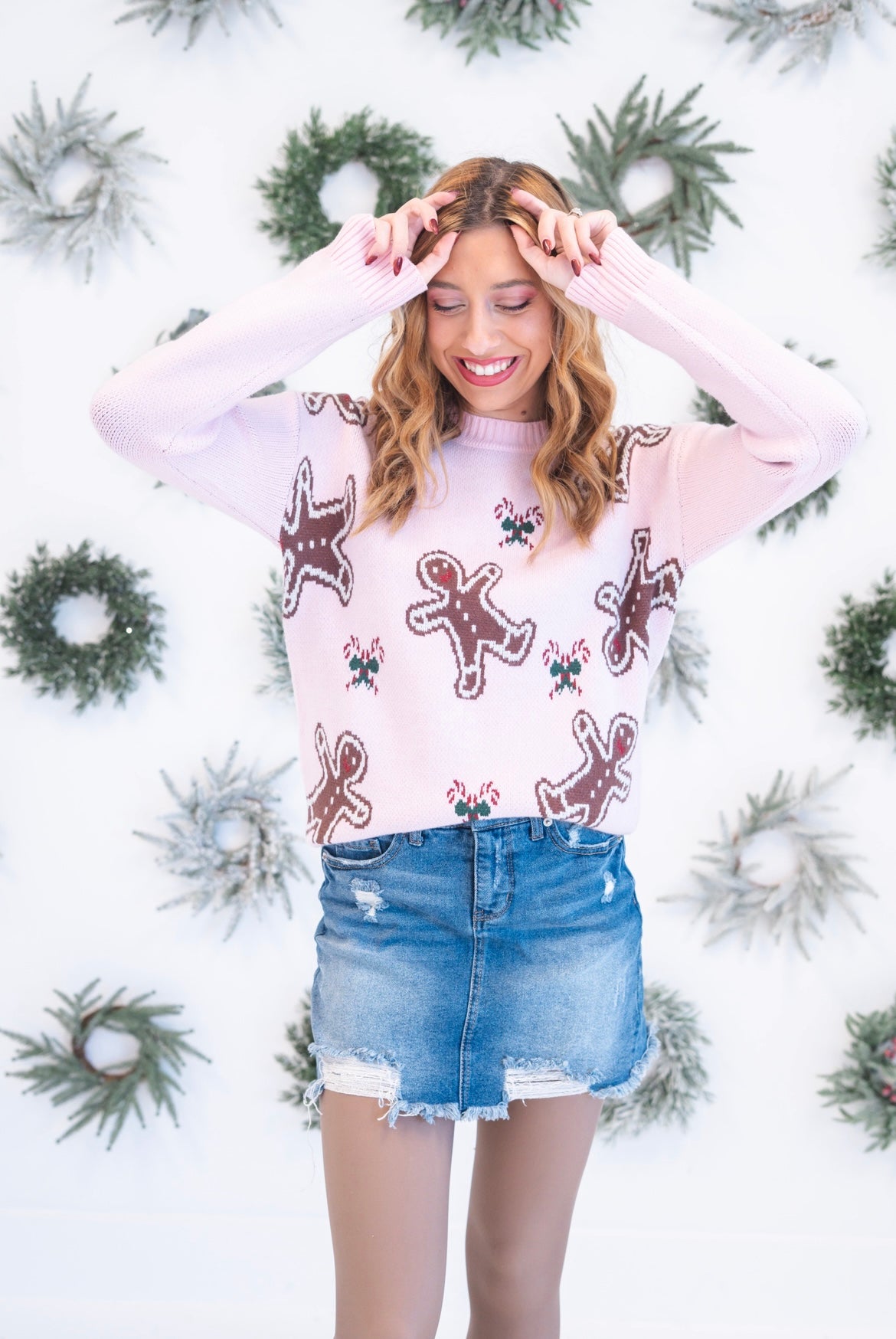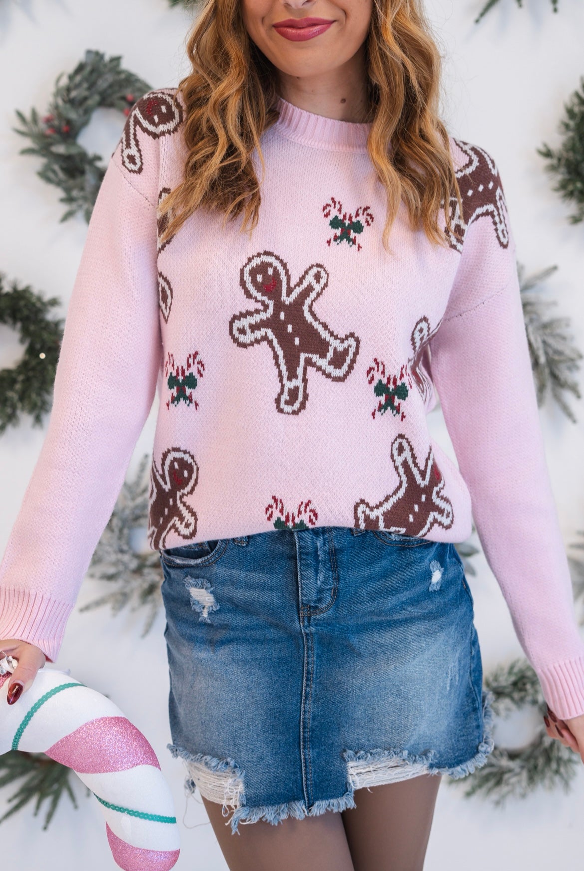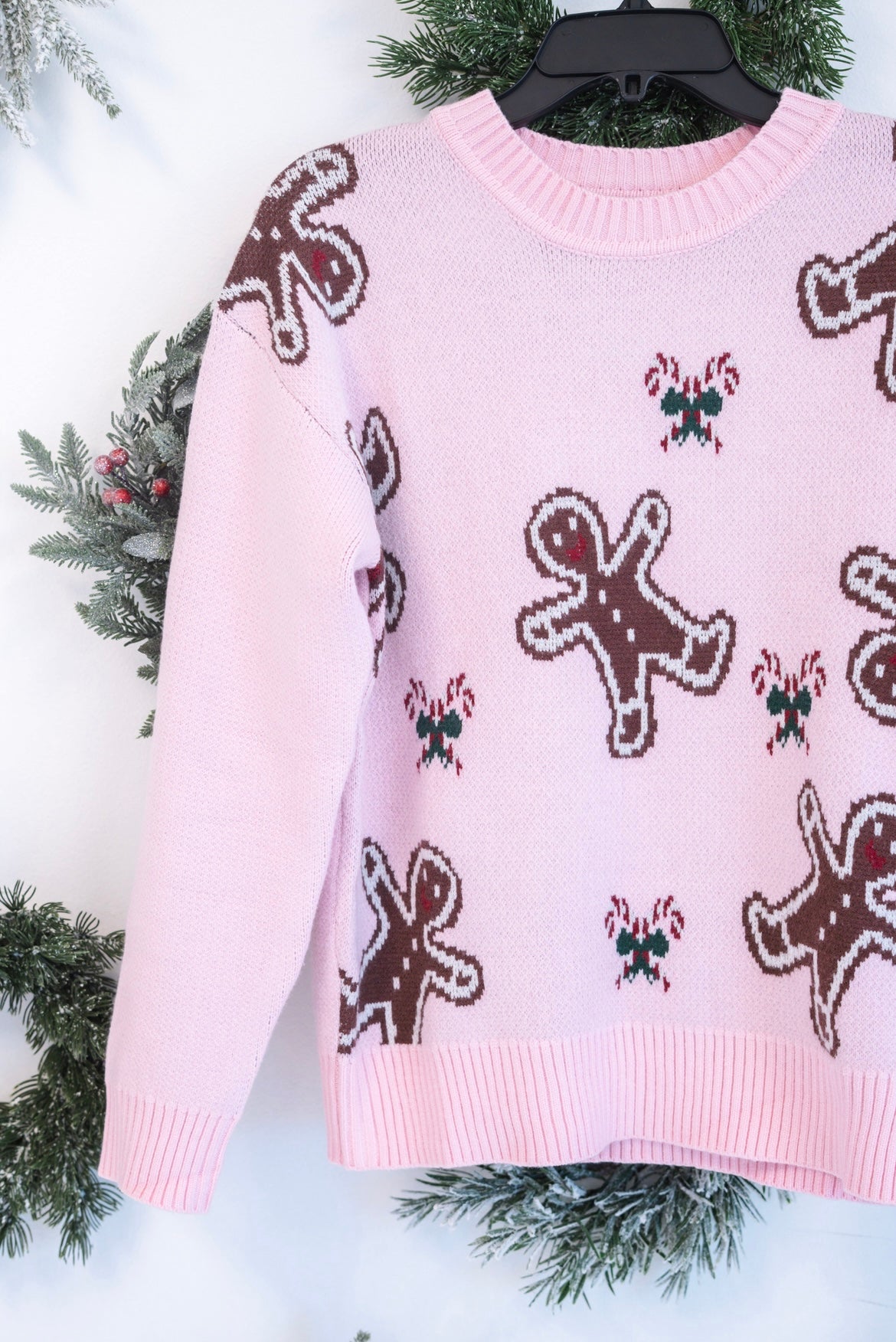 Have fun with this festive spirit in this charming pink sweater, adorned with a playful gingerbread man and candy cane pattern that captures holiday magic. The classic round neckline pairs perfectly with relaxed drop shoulders for an effortlessly chic, laid-back look that feels both cozy and contemporary. Elastic ribbed trim at the cuffs and hem ensures a comfortable, fitted finish that moves with you through holiday gatherings and winter days. Perfect for creating memorable seasonal moments with style and warmth.