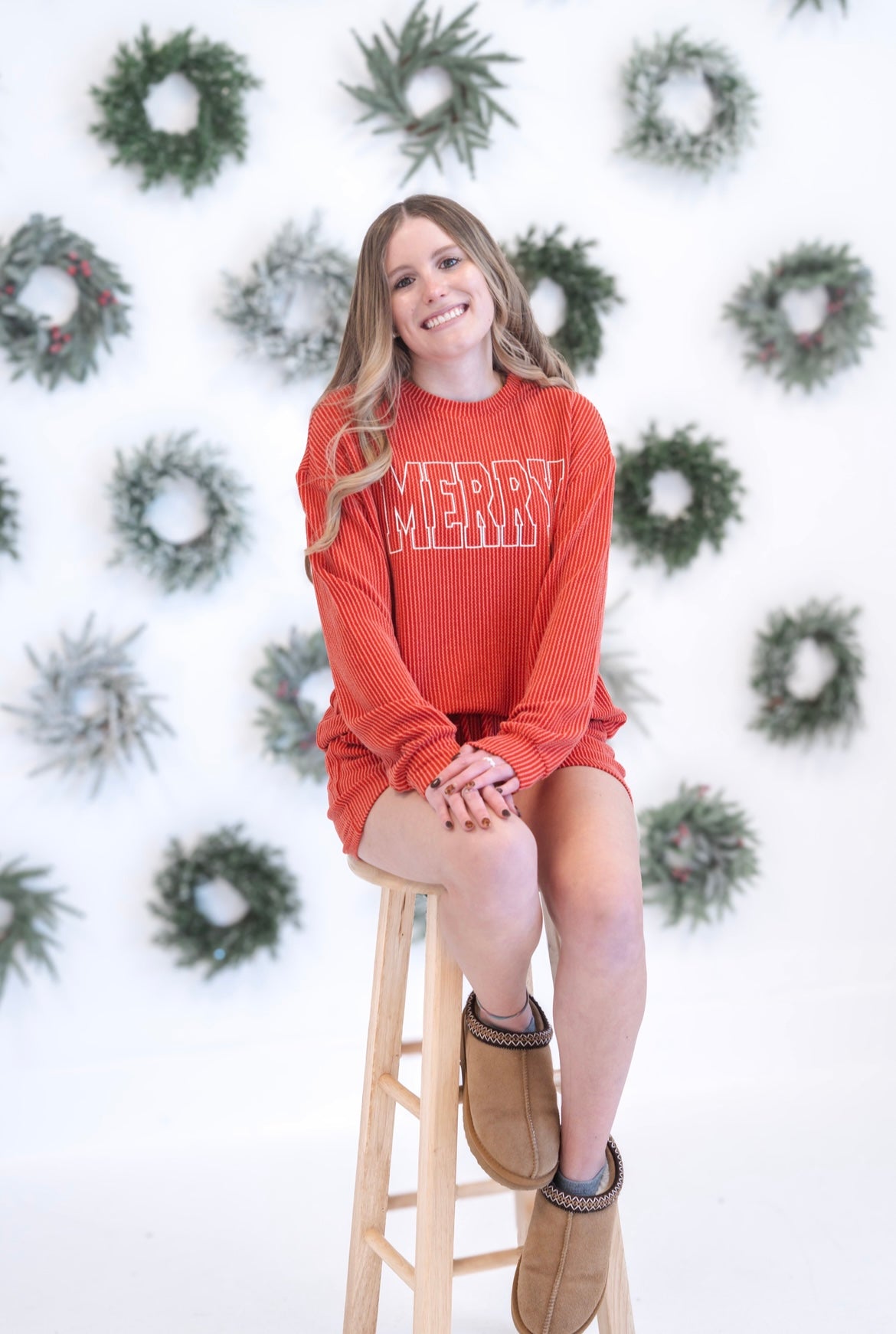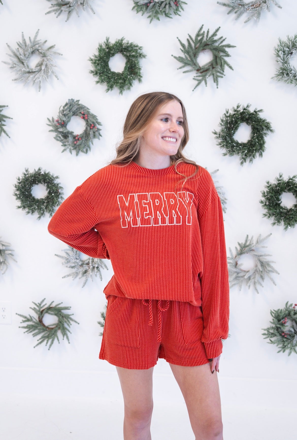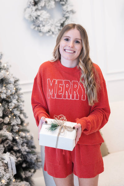 Stay cozy and festive in the Merry Lounge Short Set. Made from corded knit, this set offers a relaxed and comfortable fit, trendy high-waist shorts, and a loose silhouette with side pockets. It's perfect for relaxing and lounging during the holiday season. It's effortless chic.