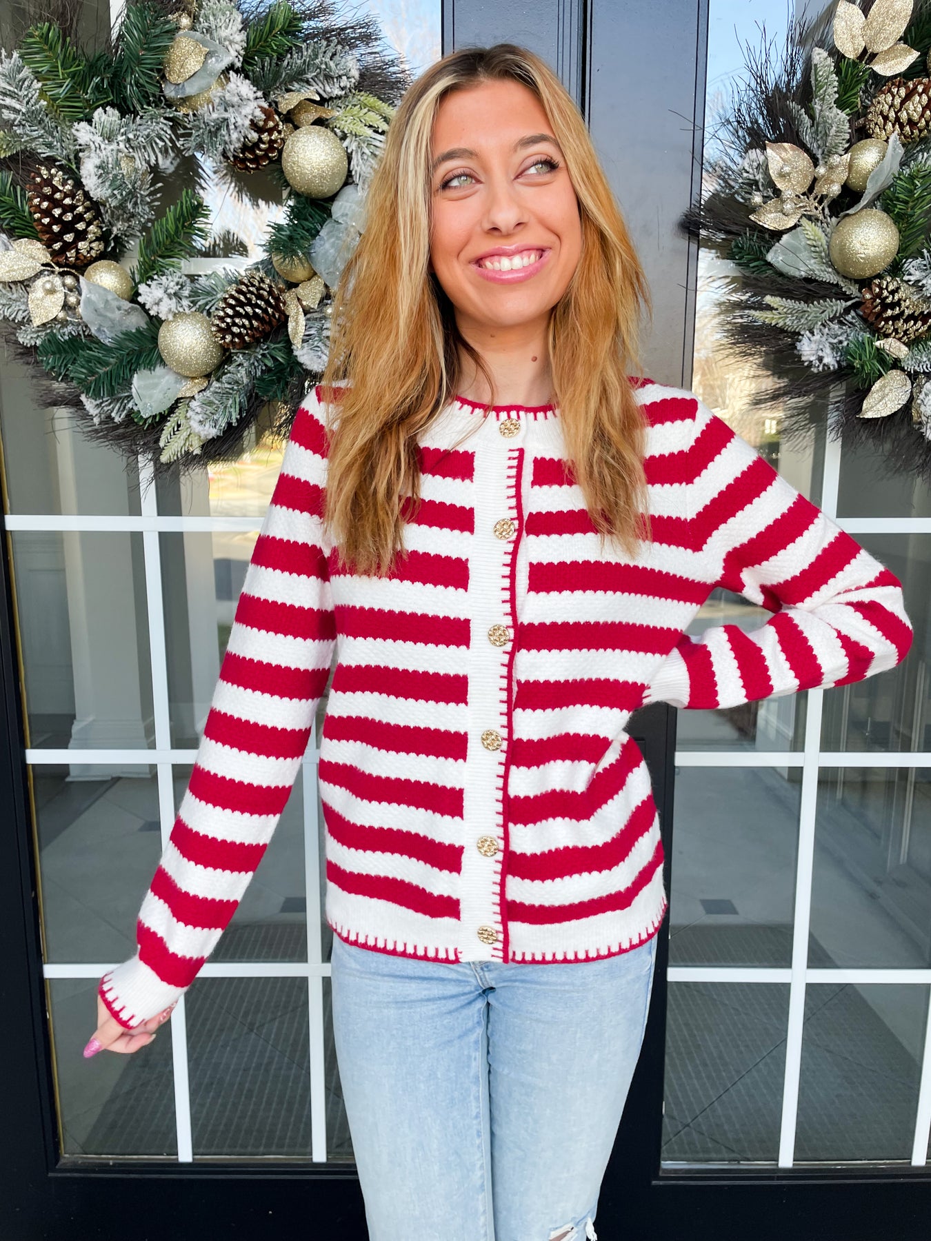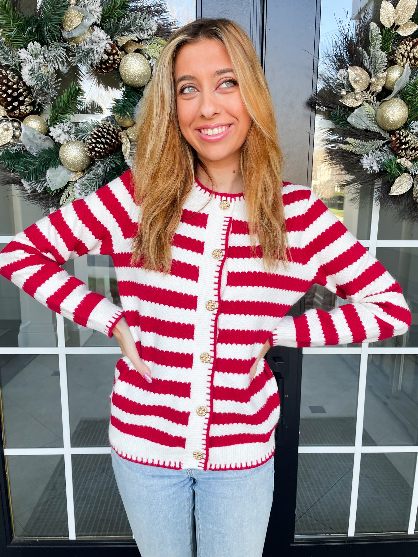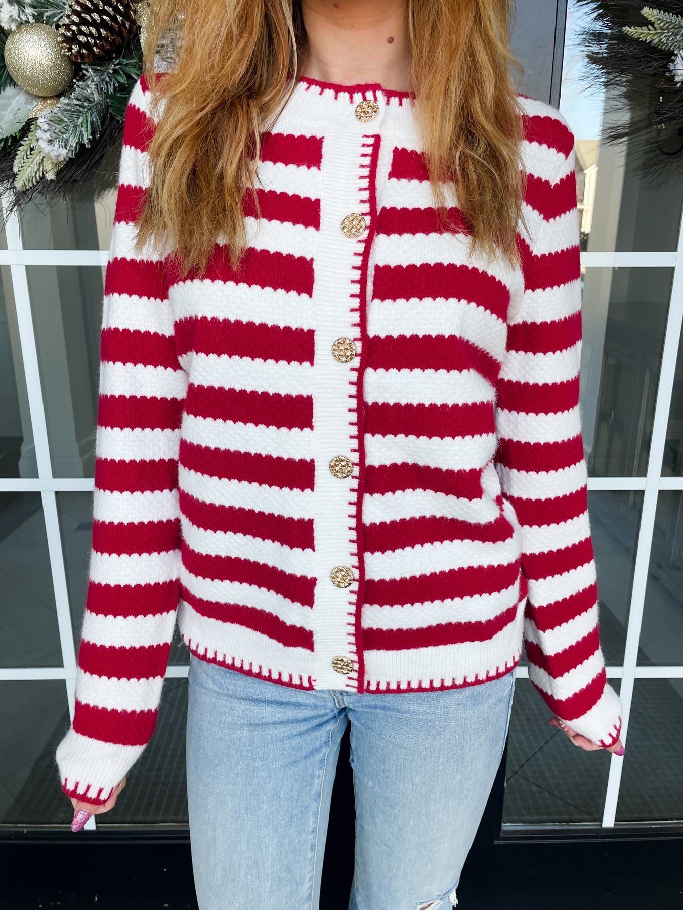 Elevate your wardrobe with this Red and White Chic Stripe Cardigan, a versatile layering essential that seamlessly transitions from day to night. The timeless striped pattern pairs beautifully with elegant knit gold buttons, creating an effortlessly sophisticated look. Designed with your comfort in mind, this cardigan features a cozy, flattering fit and functional pockets—because style shouldn't mean sacrificing practicality. Whether you're dressing up a casual tee or adding polish to an evening ensemble, this piece delivers the perfect balance of elegance and wearability.