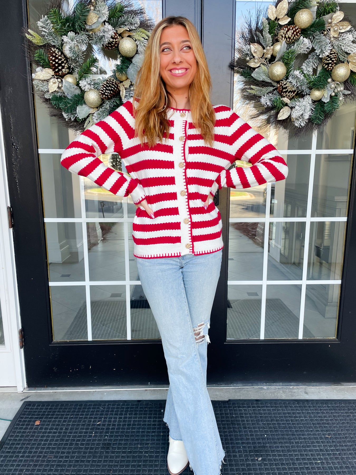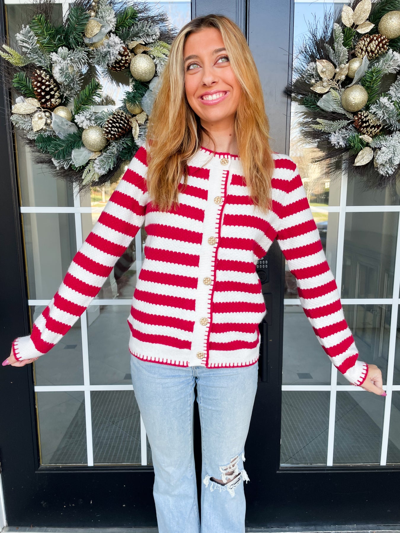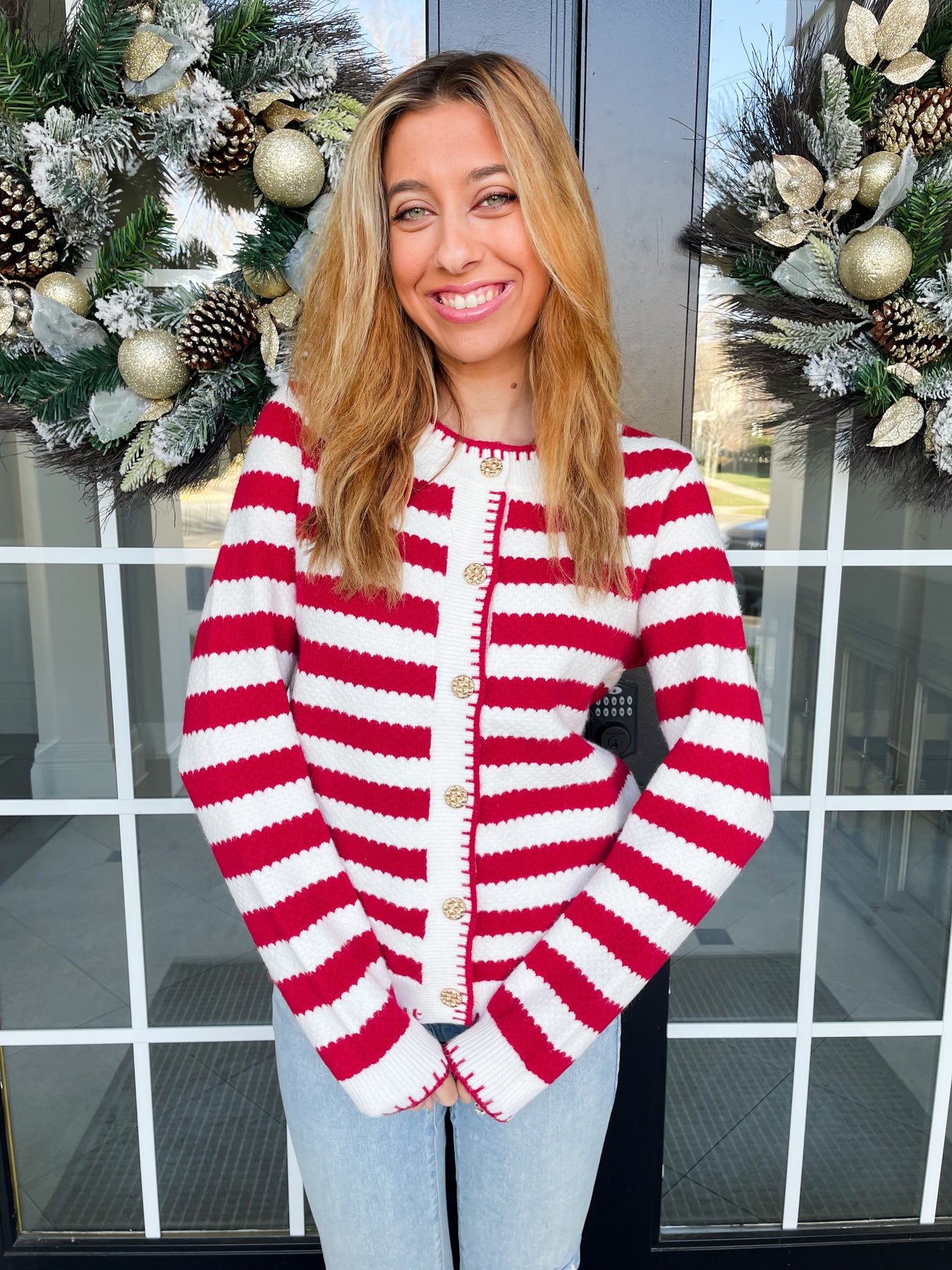 Elevate your wardrobe with this Red and White Chic Stripe Cardigan, a versatile layering essential that seamlessly transitions from day to night. The timeless striped pattern pairs beautifully with elegant knit gold buttons, creating an effortlessly sophisticated look. Designed with your comfort in mind, this cardigan features a cozy, flattering fit and functional pockets—because style shouldn't mean sacrificing practicality. Whether you're dressing up a casual tee or adding polish to an evening ensemble, this piece delivers the perfect balance of elegance and wearability.